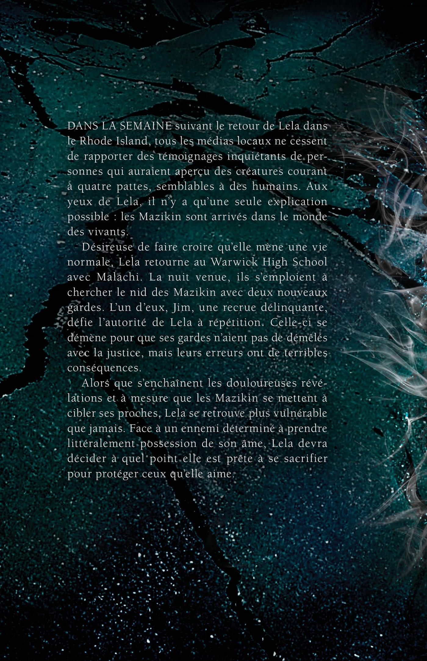 Dans la semaine suivant le retour de Lela dans le Rhode Island, tous les médias locaux ne cessent de rapporter des témoignages inquiétants de personnes qui auraient aperçu des créatures courant à quatre pattes, ressemblant à des humains. Pour Lela, il n’y a qu’une seule explication possible: les Mazikins sont arrivés dans le monde des vivants.Désireuse de faire croire qu’elle mène une vie normale, Lela retourne au Warwick HighSchool avec Malachi. La nuit venue, ils s’emploient à chercher le nid des Mazikins avec deux nouveaux gardes. L’un d’eux, Jim, une recrue délinquante, défie l’autorité de Lela à répétition. Celle-ci se démène pour que ses gardes n’aient pas de démêlés avec la justice, mais leurs erreurs ont de terribles conséquences.Alors que s’enchaînent les douloureuses révélations et que les Mazikins se mettent àcibler ses proches, Lela se retrouve plus vulnérable que jamais. Face à un ennemi déterminé à prendre possession de son âme, Lela devra décider à quel point elle est prête à se sacrifier pour protéger ceux qu’elle aime.