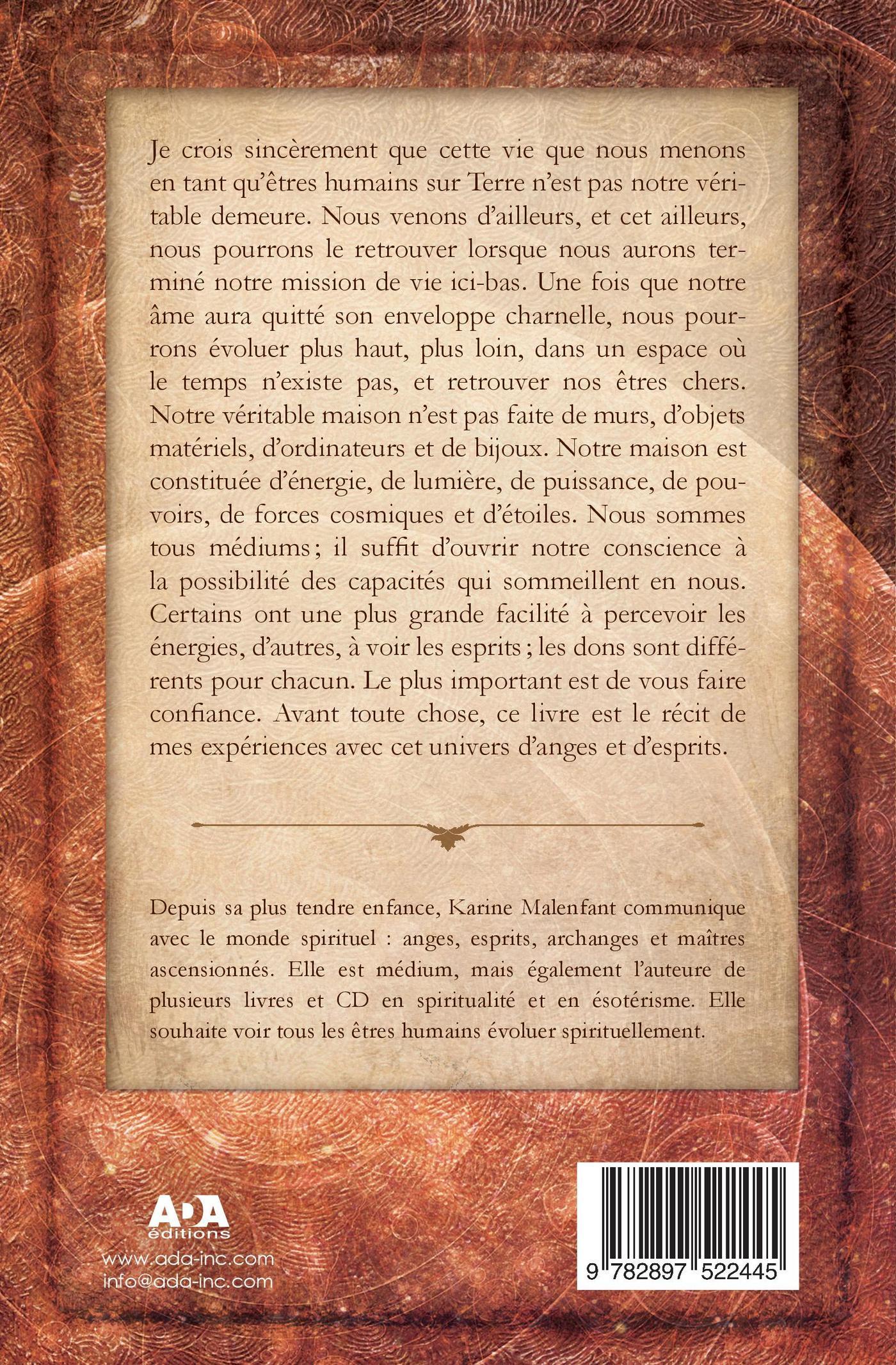 Je crois sincèrement que cette vie que nous menons en tant qu’êtres humains sur Terre n’est pas notre véritable maison. Nous venons d’ailleurs, et cet ailleurs, nous pourrons le retrouver lorsque nous aurons terminé notre mission de vie ici-bas. Une fois que notre âme aura quitté son enveloppe charnelle, nous pourrons évoluer plus haut, plus loin, dans un espace où letemps n’existe pas, et retrouver nos êtres chers. Notre véritable maison n’est pas faite de murs, d’objets matériels, d’ordinateurs et de bijoux. Notre maison est constituée d’énergie, de lumière, de puissance, de pouvoirs, de forces cosmiques et d’étoiles. Nous sommes tous médiums, il suffit d’ouvrir notre conscience à la possibilité des capacités qui sommeillent en nous. Certains ont une plus grande facilité à percevoir les énergies, d’autres à voir les esprits; les dons sont différents pour chacun. Le plus important est de vous faire confiance. Avant toute chose, ce livre est le récit de mes expériences avec cet univers d’anges et d’esprits.