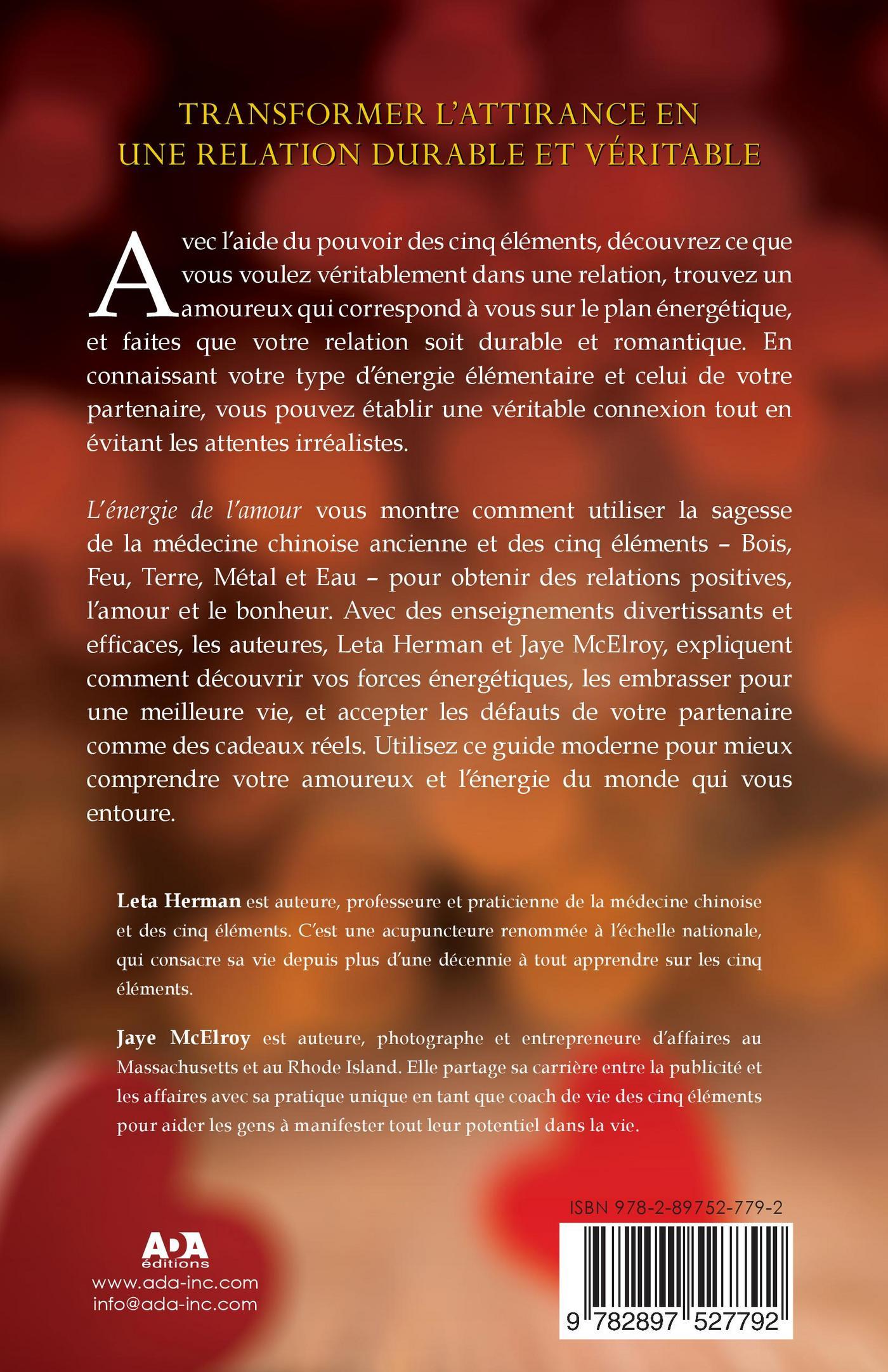 Avec l’aide du pouvoir des Cinq éléments, découvrez ce que vous voulez véritablement dans une relation, trouvez un amoureux qui correspond à vous sur le plan énergétique, et faites que votre relation soit durable et romantique. En connaissant votre type d’énergie élémentaire et celui de votre partenaire, vous pouvez établir une véritable connexion tout en évitant les attentes irréalistes. L’Énergie de l’amour vous montre comment utiliser la sagesse de la médecine chinoise ancienne et des Cinq éléments – Bois, Feu, Terre, Métal, et Eau – pour obtenir des relations positives, l’amour et le bonheur. Avec des enseignements divertissants et efficaces, les auteures, Leta Herman et Jaye McElroy expliquent comment découvrir vos forces énergétiques, les embrasser pour une meilleure vie, et accepter les défauts de votre partenaire comme des cadeaux réels. Utilisez ce guide moderne pour de mieux comprendre votre amoureux et l’énergie du monde qui vous entoure.