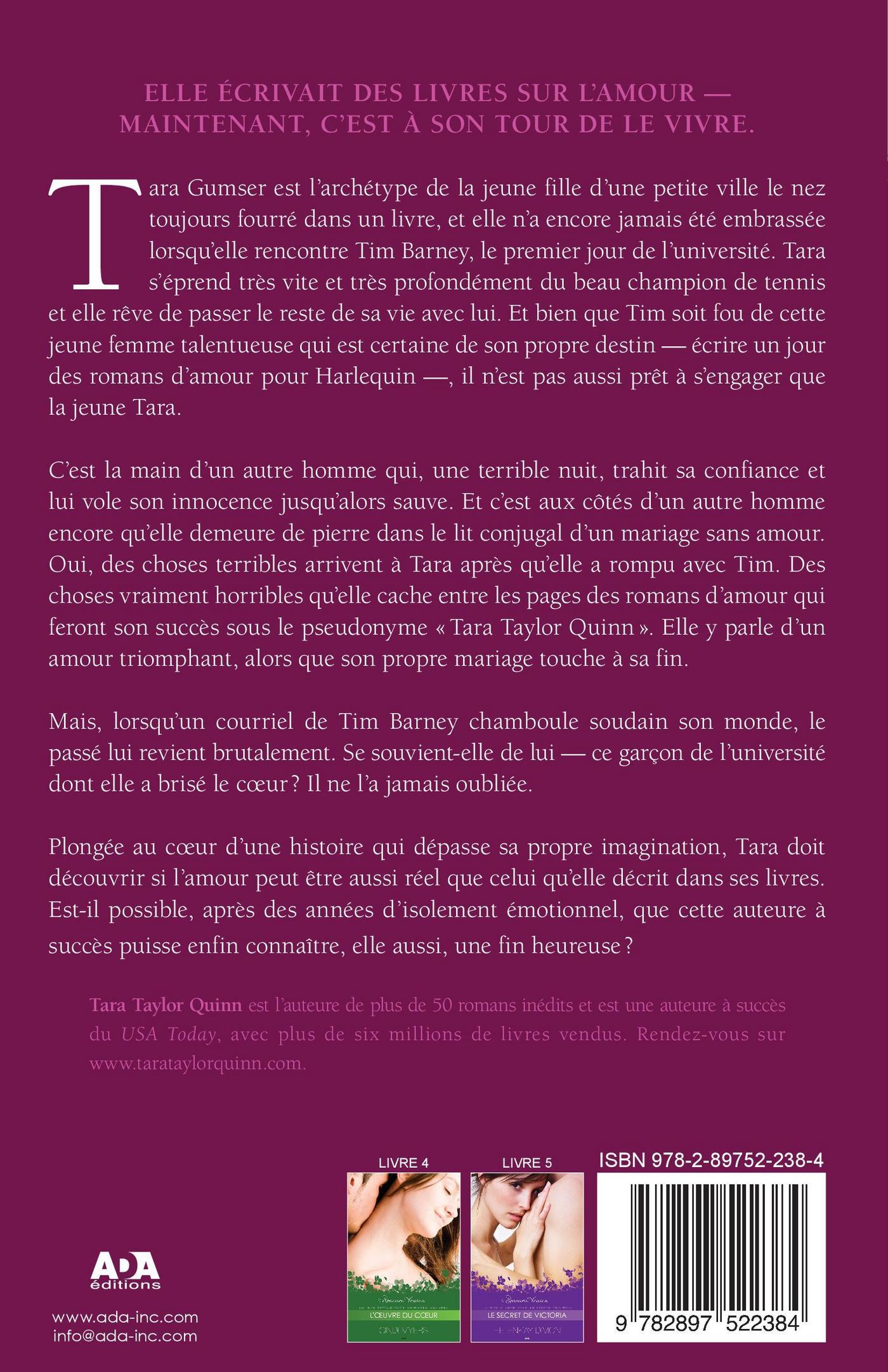 Stéréotype de la jeune fille d’une petite ville le nez toujours fourré dans un livre, Tara Gumser n’a encore jamais été embrassée lorsqu’elle rencontre Tim Barney, le premier jour de l’université. Tara s’éprend très vite et très profondément du beau champion de tennis et elle rêve de passer le reste de sa vie avec lui. Et bien que Tim soit fou de cette jeune femme talentueuse qui est certaine de son propre destin — écrire un jour des romans d’amour pour Harlequin —, il n’est pas aussi prêt à s’engager que la jeune Tara. C’est la main d’un autre homme qui, une terrible nuit, trahit sa confiance et lui vole son innocence jusqu’alors sauve. Et c’est aux côtés d’un autre homme encore qu’elle demeure de pierre dans le lit conjugal d’un mariage sans amour. Oui, des choses terribles arrivent à Tara après qu’elle ait rompu avec Tim. Des choses vraiment horribles qu’elle cache entre les pages des romans d’amour qui feront son succès sous le pseudonyme «Tara Taylor Quinn». Elle y parle d’un amour triomphant, alors que son propre mariage touche à sa fin. Mais, lorsqu’un courriel de Tim Barney chamboule soudain son monde, le passé lui revient brutalement. Se souvient-elle de lui — ce garçon de l’université dont elle a brisé le coeur? Il ne l’a jamais oubliée. Plongée au coeur d’une histoire qui dépasse sa propre imagination, Tara doit découvrir si l’amour peut être aussi réel que celui qu’elle décrit dans ses livres. Est-il possible, après des années d’isolement émotionnel, que cette auteure à succès puisse enfin connaître, elle aussi, une fin heureuse?