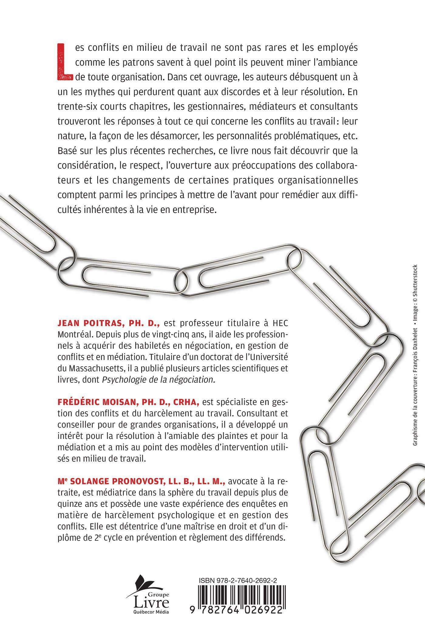 Les conflits en milieu de travail ne sont pas rares et les employés comme les patrons savent à quel point ils peuvent miner l'ambiance de toute organisation. Dans cet ouvrage, les auteurs débusquent un à un les mythes qui perdurent quant aux discordes et à leur résolution. En trente-six courts chapitres, les gestionnaires, médiateurs et consultants trouveront les réponses à tout ce qui concerne les conflits au travail?: leur nature, la façon de les désamorcer, les personnalités problématiques, etc. Basé sur les plus récentes recherches, ce livre nous fait découvrir que la considération, le respect, l'ouverture aux préoccupations des collaborateurs et les changements de certaines pratiques organisationnelles comptent parmi les principes à mettre de l'avant pour remédier aux difficultés inhérentes à la vie en entreprise.