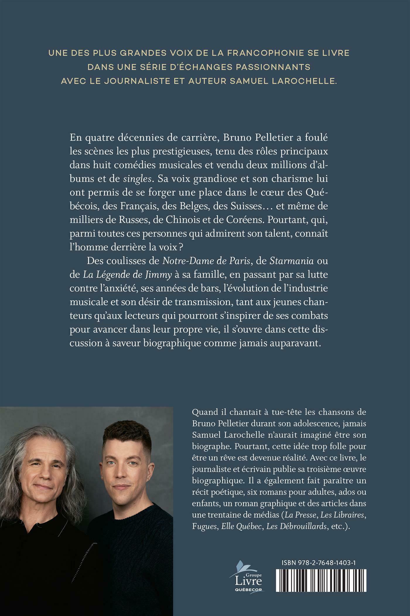 En quatre décennies de carrière, Bruno Pelletier a foulé les scènes les plus prestigieuses, tenu des rôles principaux dans cinq comédies musicales et vendu 2 millions d'albums et de singles. Sa voix grandiose et son charisme lui ont permis de se forger une place dans le cœur des Québécois, des Français, des Belges, des Suisses... et même de milliers de Russes, de Chinois et de Coréens. Pourtant, qui, parmi toutes ces personnes qui admirent son talent, connaît l'homme derrière la voix ?