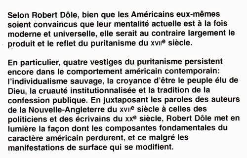 Selon Robert Dôle, bien que les Américains eux-mêmes soient convaincus que leur mentalité actuelle est à la fois moderne et universelle, elle serait au contraire largement le produit et le reflet du puritanisme du XVIIe siècle.