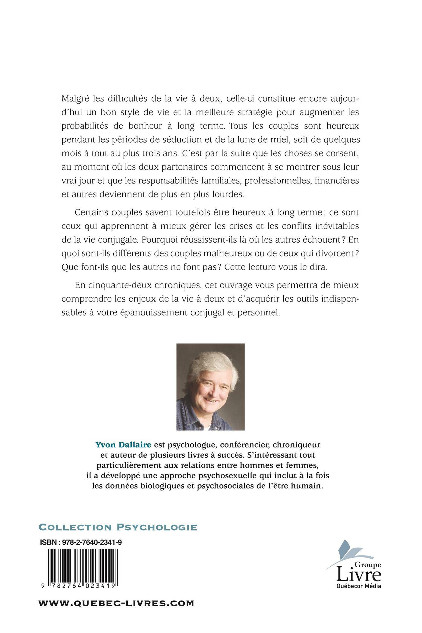 Malgré les difficultés de la vie à deux, celle-ci constitue encore aujourd'hui un bon style de vie et la meilleure stratégie pour augmenter les probabilités de bonheur à long terme. Tous les couples sont heureux pendant les périodes de séduction et de la lune de miel, soit de quelques mois à tout au plus trois ans. C'est par la suite que les choses se corsent, au moment où les deux partenaires commencent à se montrer sous leur vrai jour et que les responsabilités familiales, professionnelles, financières et autres deviennent de plus en plus lourdes.Certains couples savent toutefois être heureux à long terme?: ce sont ceux qui apprennent à mieux gérer les crises et les conflits inévitables de la vie conjugale. Pourquoi réussissent-ils là où les autres échouent?? En quoi sont-ils différents des couples malheureux ou de ceux qui divorcent?? Que font-ils que les autres ne font pas?? Cette lecture vous le dira. En cinquante-deux chroniques, cet ouvrage vous permettra de mieux comprendre les enjeux de la vie à deux et d'acquérir les outils indispensables à votre épanouissement conjugal et personnel. Yvon Dallaire est psychologue, conférencier,chroniqueur et auteur de plusieurs livres à succès. S'intéressant tout particulièrement aux relations entre hommes et femmes, il a développé une approche psycho-sexuelle qui inclut à la fois les données biologiques et psychosociales de l'être humain.