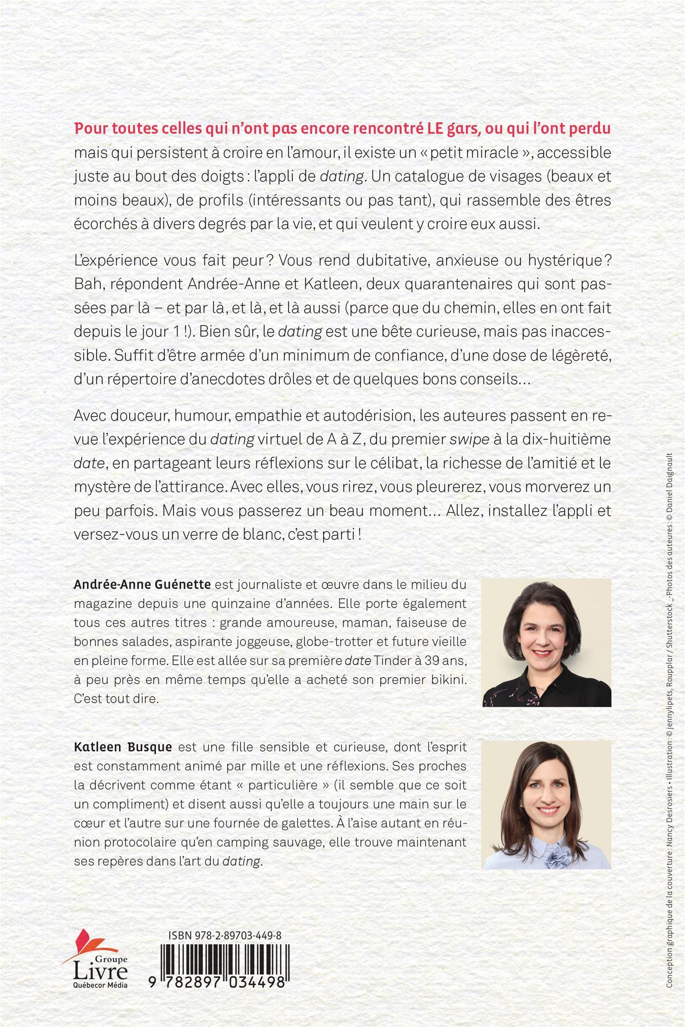 Avec douceur, humour, empathie et autodérision, les auteures passent en revue l'expérience du dating virtuel de A à Z, du premier swipe à la dix-huitième date, en partageant leurs réflexions sur le célibat, la richesse de l'amitié et le mystère de l'attirance. Avec elles, vous rirez, vous pleurerez, vous morverez un peu parfois. Mais vous passerez un beau moment… Allez, installez l'appli et versez-vous un verre de blanc, c'est parti!