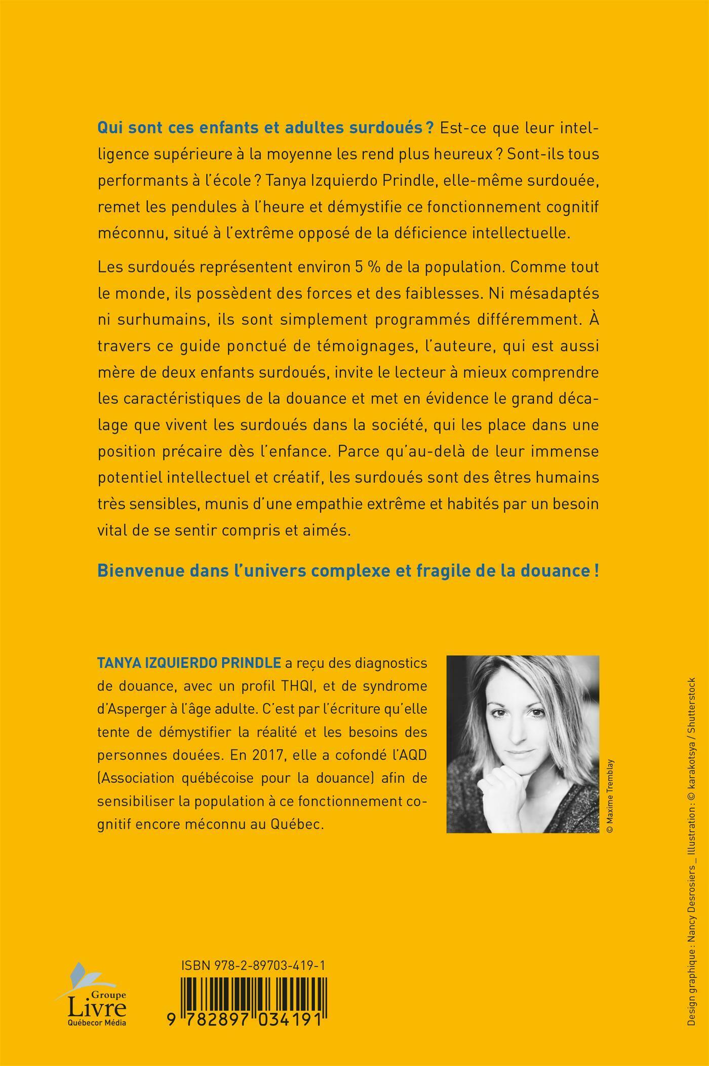 . Les surdoués représentent environ 5% de la population. Comme tout le monde, ils possèdent des forces et des faiblesses. Ni mésadaptés ni surhumains, ils sont simplement programmés différemment. À travers ce guide ponctué de témoignages, l'auteure, qui est aussi mère de deux enfants surdoués, invite le lecteur à mieux comprendre les caractéristiques de la douance et met en évidence le grand décalage que vivent les surdoués dans la société, qui les place dans une position précaire dès l'enfance. Parce qu'au-delà de leur immense potentiel intellectuel et créatif, les surdoués sont des êtres humains très sensibles, munis d'une empathie extrême et habités par un besoin vital de se sentir compris et aimés. Bienvenue dans l'univers complexe et fragile de la douance!