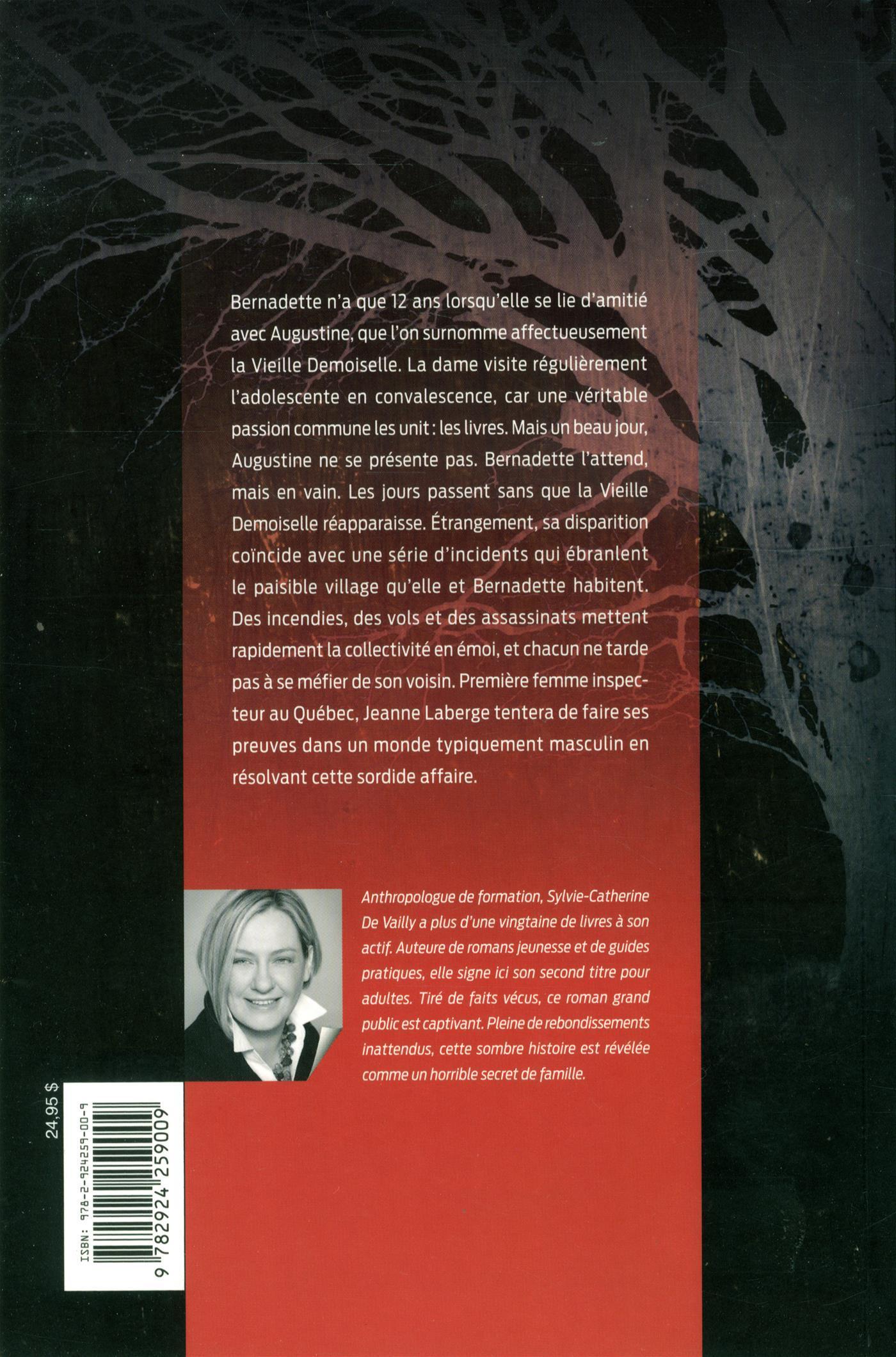"Bernadette n’a que 12 ans lorsqu’elle se lie d’amitié avec Augustine, qu’on surnomme affectueusement dans le village «la vieille demoiselle». Celle-ci visite régulièrement la gamine en convalescence. Une passion commune les unit, les livres. Un beau jour, Bernadette attend Augustine en vain, elle qui lui avait pourtant dit qu’elle passerait la voir. Les jours se suivent sans que la vieille demoiselle réap paraisse. Sa disparition coïncide avec une série d’incendies et d’autres éléments troublants. La police accentue ses recherches lorsque la maison d’Augustine est incendiée. Dans un village aussi tranquille, cette série d’événements met rapidement les habitants en émoi, et on ne tarde pas à se méfier les uns des autres. Jeanne Laberge est chargée de l’enquête. Première femme inspecteur au Québec, elle tentera de faire ses preuves dans un monde typiquement masculin, mais une réalité bien sordide l’attend. Ce roman grand public de Sylvie-Catherine De Vailly est tiré de faits vécus. Cette sombre affaire, pleine de rebondissements inattendus, hante la narratrice depuis son plus jeune âge. Elle s’en libère, mais peut-on se libérer totalement d’un si horrible secret ?"