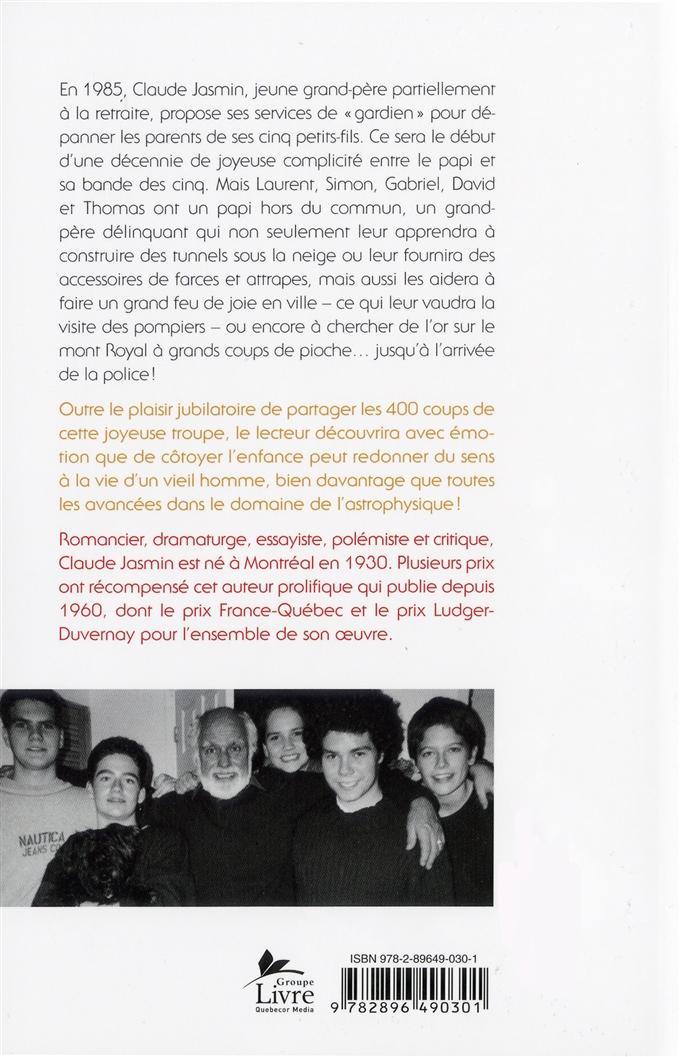 En 1985, Claude Jasmin, jeune grand-père partiellement à la retraite, propose ses services de « gardien » pour dépanner les parents de ses cinq petits-fils. Ce sera le début d'une décennie de joyeuse complicité entre le papi et sa bande des cinq. Mais Laurent, Simon, Gabriel, David et Thomas ont un papi hors du commun, un grand-père délinquant qui non seulement leur apprendra à construire des tunnels sous la neige ou leur fournira des accessoires de farces et attrapes, mais aussi les aidera à faire un grand feu de joie en ville – ce qui leur vaudra la visite des pompiers – ou encore à chercher de l'or sur le mont Royal à grands coups de pioche... jusqu'à l'arrivée de la police !