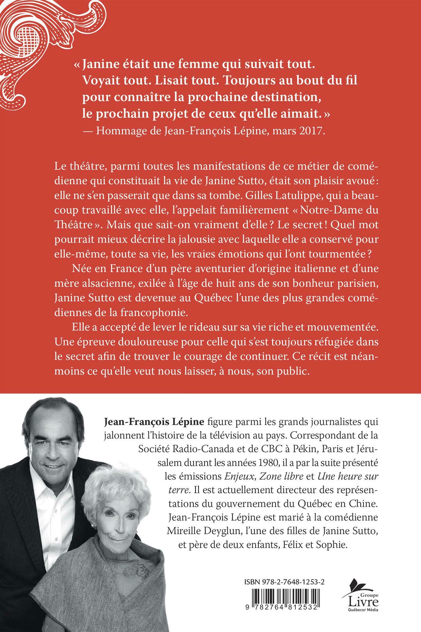 Le secret ! Quel mot pourrait mieux décrire la jalousie avec laquelle Janine Sutto a conservé pour elle-même, toute sa vie durant, les vraies émotions qui l'ont tourmentée ? Artiste au talent immense, cette femme, que son vieil associé Gilles Latulippe surnomme « Notre-Dame du Théâtre », a incarné les plus grands rôles féminins du théâtre classique et a contribué à la naissance de la télévision en langue française en Amérique ; ses rôles comiques ont attiré les foules. Mais jamais, pendant plus de soixante-dix ans de vie publique, elle ne s'est livrée vraiment. Petite fille déracinée à l'âge de neuf ans de son bonheur parisien, Janine Sutto représente à elle seule toute la renaissance culturelle qui a abouti à la richesse créative du Québec d'aujourd'hui. Pour la première fois, à près de quatre-vingt-dix ans, elle a accepté de lever le rideau sur sa vie riche et tourmentée.