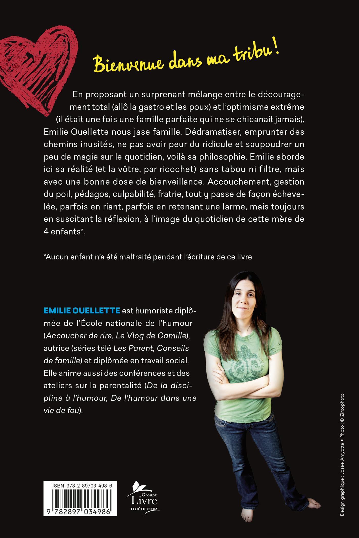 En proposant un surprenant mélange entre le découragement total (allô la gastro et les poux) et l'optimisme extrême (il était une fois une famille parfaite qui ne se chicanait jamais), Emilie Ouellette nous jase famille. Dédramatiser, emprunter des chemins inusités, ne pas avoir peur du ridicule et saupoudrer un peu de magie sur le quotidien, voilà sa philosophie.