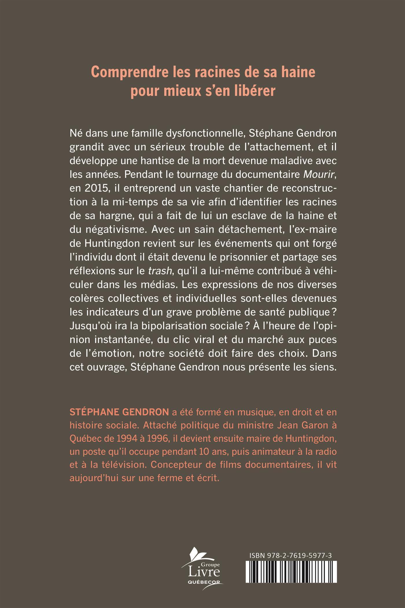 Né dans une famille dysfonctionnelle, Stéphane Gendron grandit avec un sérieux trouble de l'attachement, et il développe une hantise de la mort devenue maladive avec les années. Pendant le tournage du documentaire Mourir, en 2015, il entreprend un vaste chantier de reconstruction à la mi-temps de sa vie afin d'identifier les racines de sa hargne, qui a fait de lui un esclave de la haine et du négativisme.