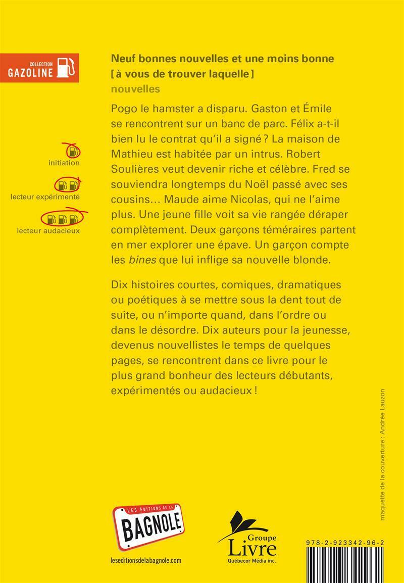 Il faut bien le dire, nous avons rassemblé dans ce recueil des auteurs exceptionnels, parmi lesquels certains des plus grands noms de la littérature pour la jeunesse. Vous ne les connaissez pas ? C'est le moment de les découvrir. . .Pogo le hamster a disparu. Gaston et Émile se rencontrent sur un banc de parc. Félix a-t-il bien lu le contrat qu'il a signé ? La maison de Mathieu est habitée par un intrus. .Robert Soulières veut devenir riche et célèbre. Fred se souviendra longtemps du Noël passé avec ses cousins… Maude aime Nicolas, qui ne l'aime plus. Une jeune fille voit .sa vie rangée déraper complètement. Deux garçons téméraires partent en mer explorer une épave. Un garçon compte les bines que lui inflige sa nouvelle blonde. .Laquelle de ces nouvelles est la moins bonne ? Robert Soulières a pris sur lui d'écrire la plus pitoyable nouvelle que l'on puisse imaginer. Merci Robert !