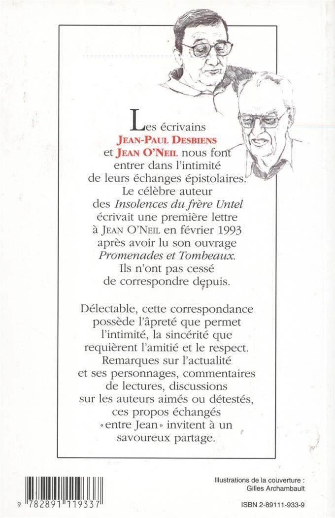 Les écrivains Jean-Paul Desbiens et Jean O'Neil nous font entrer dans l'intimité de leurs échanges épistolaires. Le célèbre auteur des Insolences du frère Untel écrivait une première lettre à Jean O'Neil en février 1993 après avoir lu son ouvrage Promenades et Tombeaux. Ils n'ont cessé de correspondre depuis.Délectable, cette correspondance possède l'âpreté que permet l'intimité, la sincérité que requièrent l'amitié et le respect. Remarques sur l'actualité et ses personnages, commentaires de lectures, discussions sur les auteurs aimés ou détestés, ces propos échangés «entre Jean» invitent à un savoureux partage.