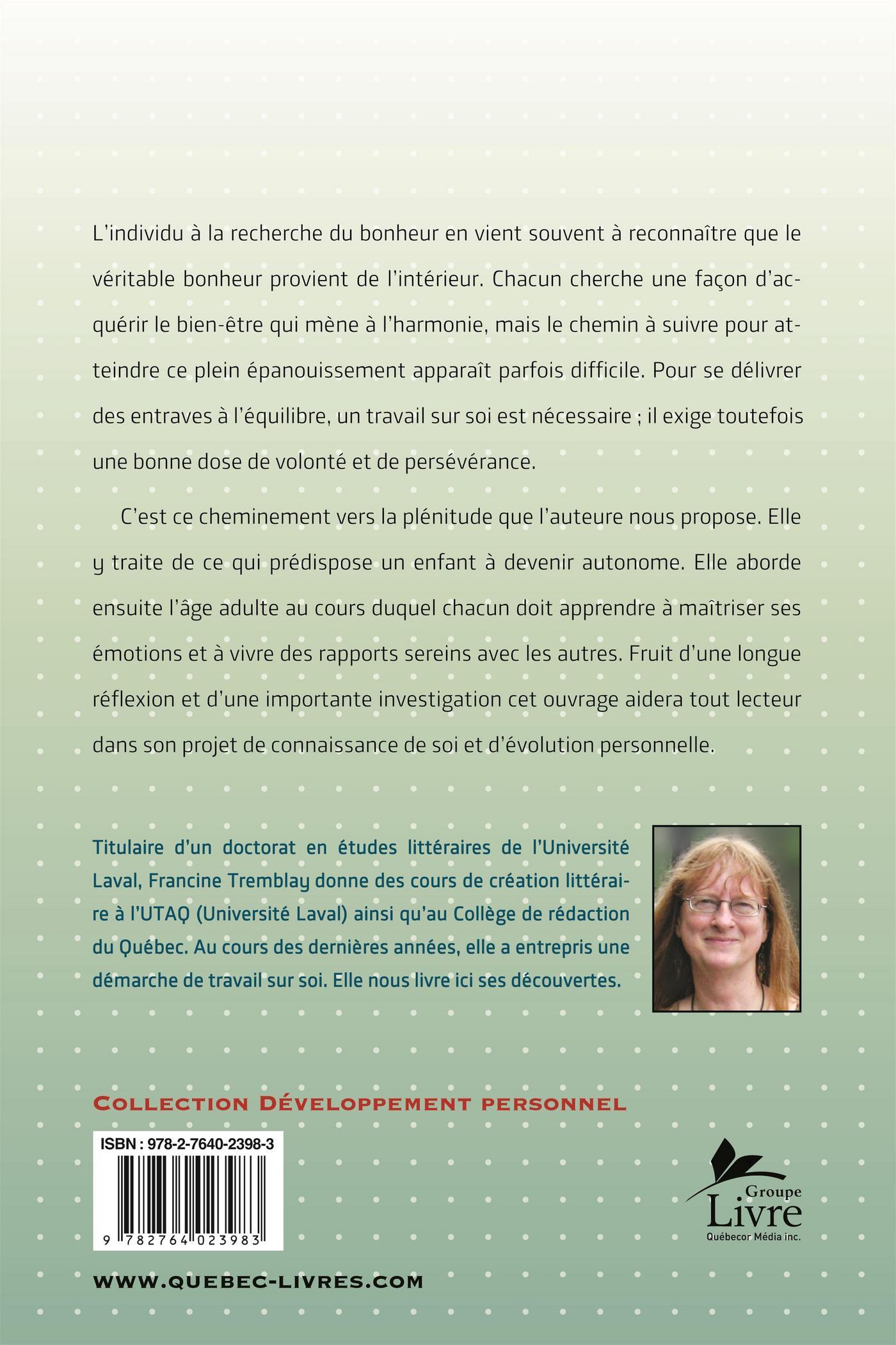 .. C'est ce cheminement vers la plénitude que l'auteure nous propose. Elle y traite de ce qui prédispose un enfant à devenir autonome. Elle aborde ensuite l'âge adulte au cours duquel chacun doit apprendre à maîtriser ses émotions et à vivre des rapports sereins avec les autres. Fruit d'une longue réflexion et d'une importante investigation cet ouvrage aidera tout lecteur dans son projet de connaissance de soi et d'évolution personnelle.