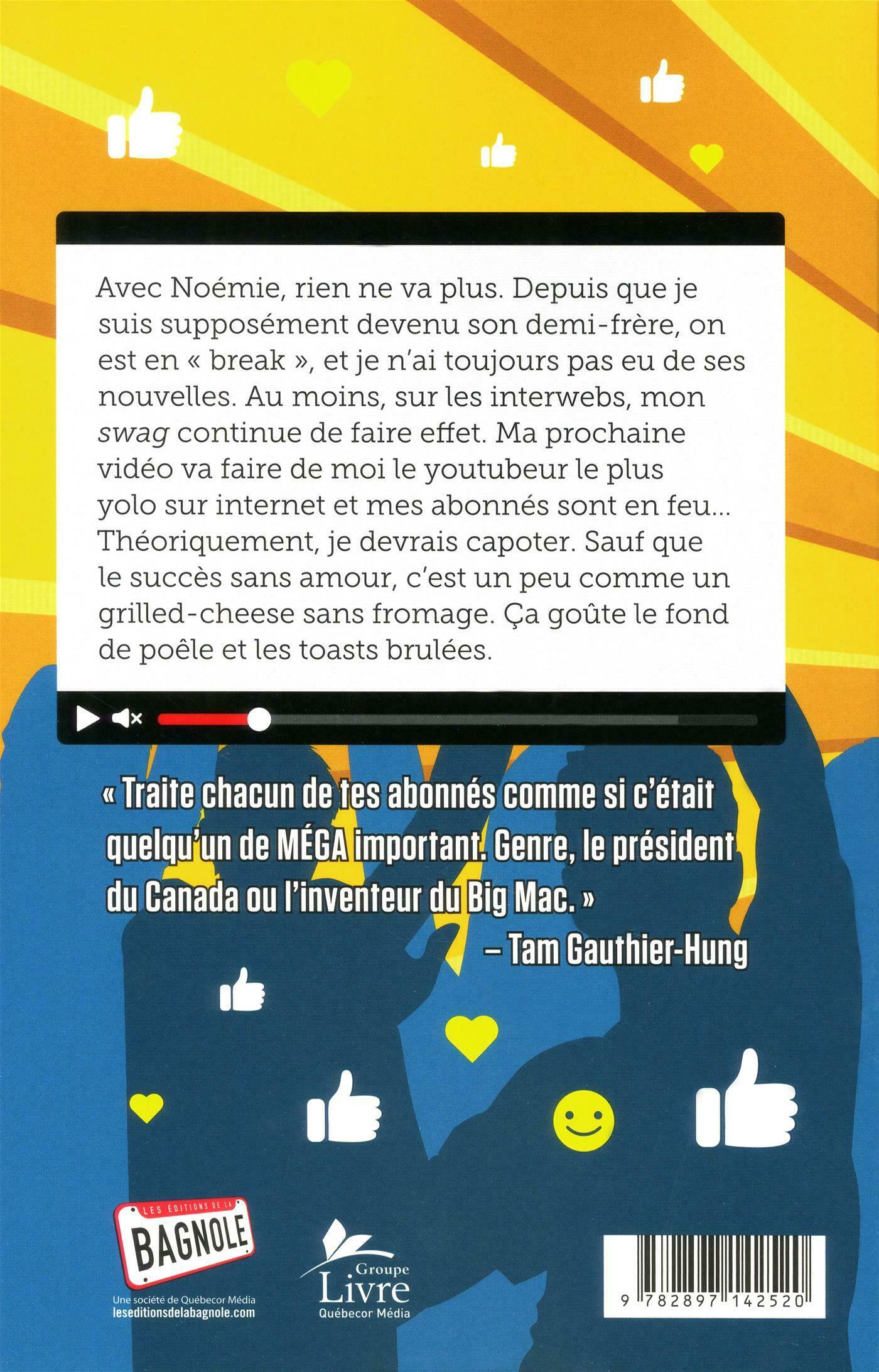Avec Noémie, rien ne va plus. Depuis que je suis supposément devenu son demi-frère, on est en « break », et je n'ai toujours pas eu de ses nouvelles. Au moins, sur les interwebs, mon swag continue de faire effet. Ma prochaine vidéo va faire de moi le youtubeur le plus yolo sur internet et mes abonnés sont en feu... Théoriquement je devrais capoter. Sauf que le succès sans amour, c'est un peu comme un grilled-cheese sans fromage. Ça goûte le fond de poêle et les toasts brûlées..