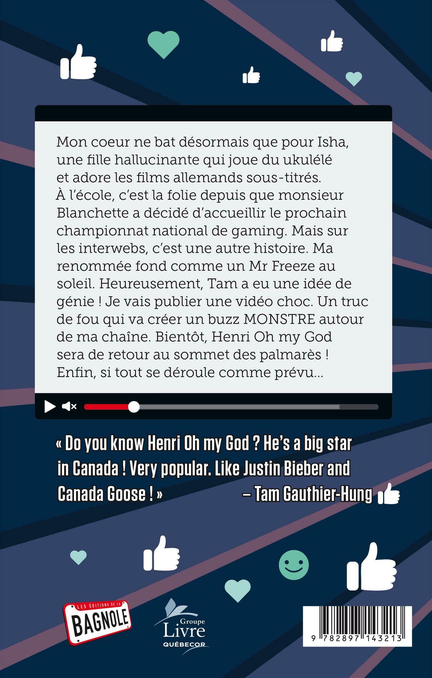 Mon coeur ne bat désormais que pour Isha,.une fille hallucinante qui joue du ukulélé.et adore les films allemands sous-titrés..À l'école, c'est la folie depuis que monsieur.Blanchette a décidé d'accueillir le prochain.championnat national de gaming. Mais sur.les interwebs, c'est une autre histoire. Ma.renommée fond comme un Mr Freeze au.soleil. Heureusement, Tam a eu une idée de.génie ! Je vais publier une vidéo choc. Un truc.de fou qui va créer un buzz MONSTRE autour.de ma chaîne. Bientôt, Henri Oh my God.sera de retour au sommet des palmarès !.Enfin, si tout se déroule comme prévu…