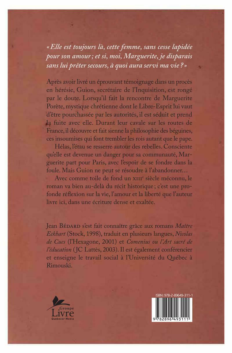Après avoir livré un éprouvant témoignage dans un procès en hérésie, Guion, secrétaire de l'Inquisition, est rongé par le doute. Lorsqu'il fait la rencontre de Marguerite Porète, mystique chrétienne dont le Libre-Esprit lui vaut d'être pourchassée par les autorités, il est séduit et prend la fuite avec elle. Durant leur cavale sur les routes de France, il découvre et fait sienne la philosophie des béguines,les insoumises qui font trembler les rois autant que le pape.