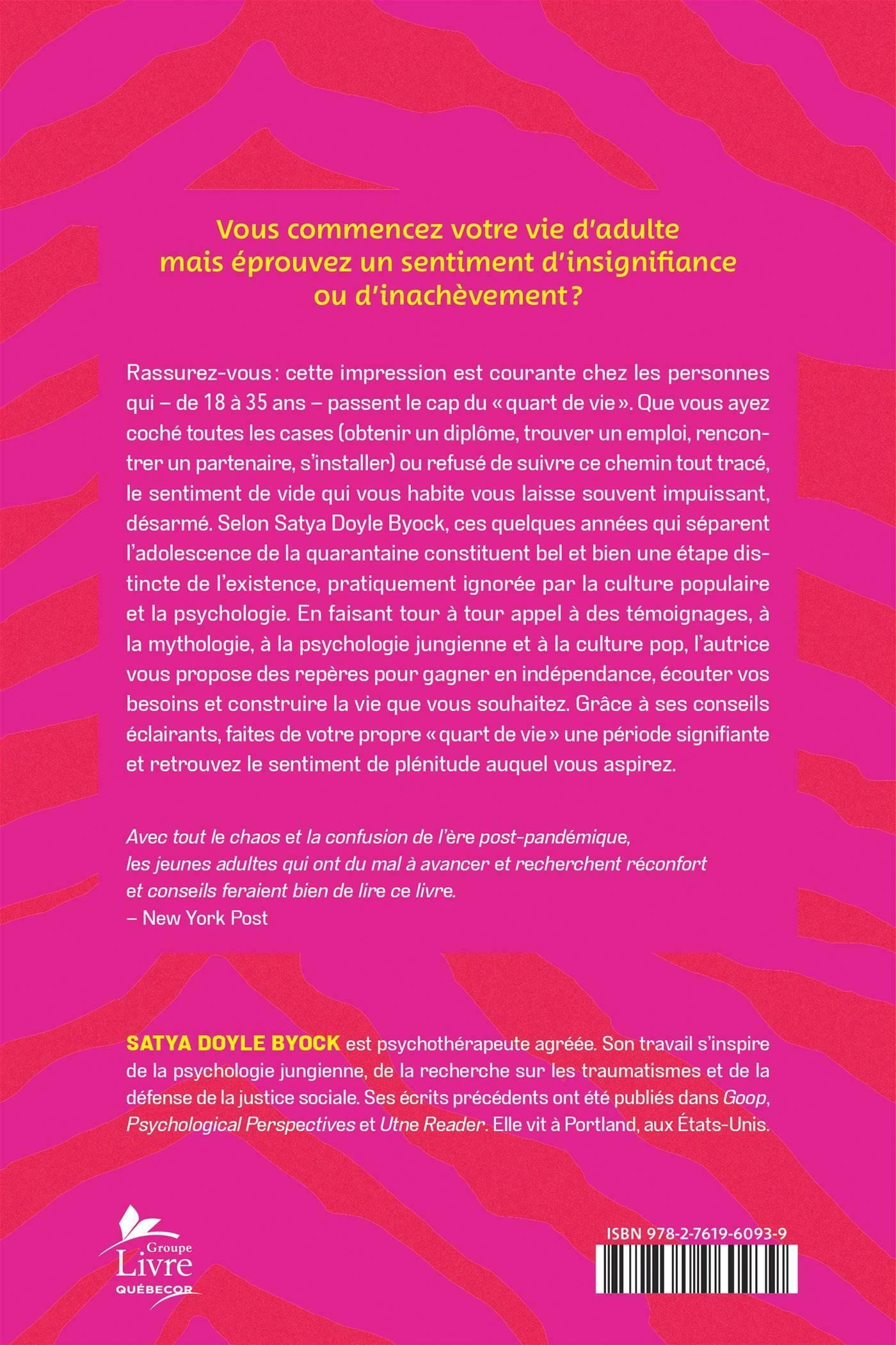 Selon Satya Doyle Byock, ces quelques années qui séparent l'adolescence de la quarantaine constituent bel et bien une étape distincte de l'existence, pratiquement ignorée par la culture populaire et la psychologie. En faisant tour à tour appel à des témoignages, à la mythologie, à la psychologie jungienne et à la culture pop, l'autrice vous propose des repères pour gagner en indépendance, écouter vos besoins et construire la vie que vous souhaitez.