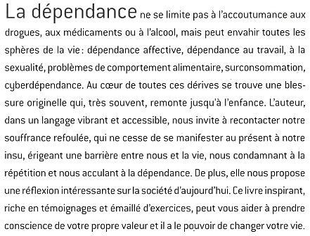 La dépendance ne se limite pas à l'accoutumance aux drogues, aux médicaments ou à l'alcool, mais peut envahir toutes les sphères de la vie : dépendance affective, investissement excessif dans le travail, dépendance à la sexualité, problèmes de comportement alimentaire, cyberdépendance. Au cœur de toutes ces dérives se trouve une blessure originelle qui, très souvent, remonte jusqu'à l'enfance. L'auteur, dans un langage vibrant et accessible, nous invite à recontacter notre souffrance refoulée, qui ne cesse de se manifester au présent à notre insu, érigeant une barrière entre nous et la vie, nous condamnant à la répétition et nous acculant à la dépendance. De plus, elle nous propose une réflexion intéressante sur la société d'aujourd'hui. Ce livre rafraîchissant, riche en témoignages et rempli d'exercices simples et efficaces, vous aidera à retrouver votre pouvoir et à vivre en paix avec vous-même.