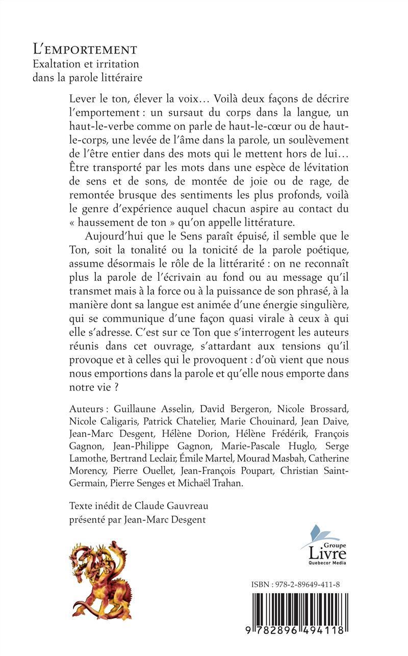 Auteurs : Guillaune Asselin, David Bergeron, Nicole Brossard, Nicole Caligaris, Patrick Chatelier, Marie Chouinard, Jean Daive, Jean-Marc Desgent, Hélène Dorion, Hélène Frédérik, François Gagnon, Jean-Philippe Gagnon, Marie-Pascale Huglo, Serge Lamothe, Bertrand Leclair, Émile Martel, Mourad Masbah, Catherine Morency, Pierre Ouellet, Jean-François Poupart, Christian Saint-Germain, Pierre Senges et Michaël Trahan.