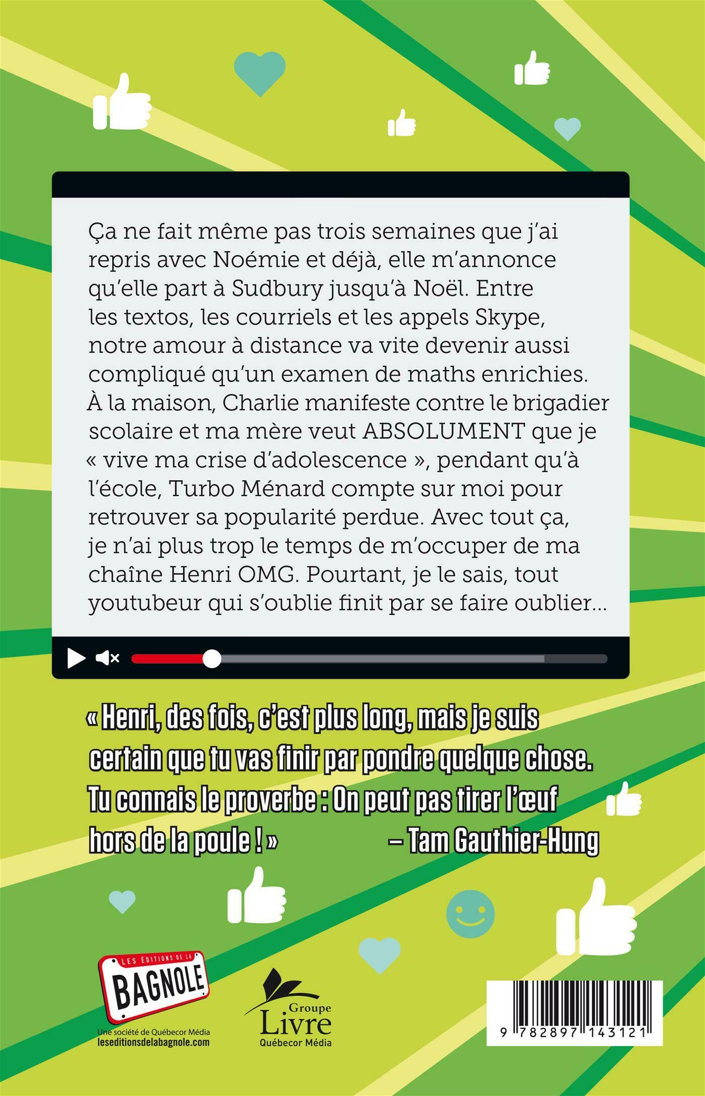 Ça ne fait même pas trois semaines que j'ai repris avec Noémie et déjà, elle m'annonce qu'elle part à Sudbury jusqu'à Noël. Entre les textos, les courriels et les appels Skype, notre amour à distance va vite devenir aussi compliqué qu'un examen de maths enrichies...À la maison, Charlie manifeste contre le brigadier scolaire et ma mère veut ABSOLUMENT que je « vive ma crise d'adolescence », pendant qu'à l'école, Turbo Ménard compte sur moi pour retrouver sa popularité perdue. Avec tout ça, je n'ai plus trop le temps de m'occuper de ma chaîne Henri OMG. Pourtant, je le sais, tout youtubeur qui s'oublie finit par se faire oublier...