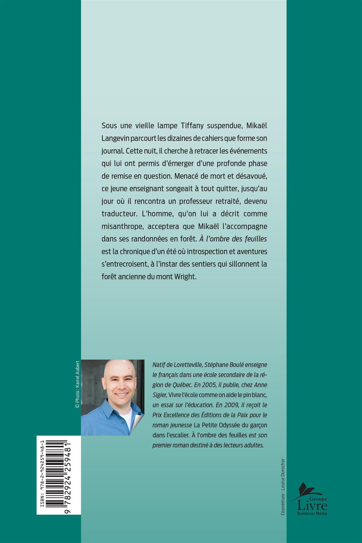 Sous une vieille lampe Tiffany suspendue, Mikaël Langevin parcourt les dizaines de cahiers que forme son journal. Cette nuit, il cherche à retracer les événements qui lui ont permis d'émerger d'une profonde phase de remise en question. Menacé de mort et désavoué, ce jeune enseignant songeait à tout quitter, jusqu'au jour où il rencontra un professeur retraité, devenu traducteur. L'homme, qu'on lui a décrit comme misanthrope, acceptera que Mikaël l'accompagne dans ses randonnées en forêt. À l'ombre des feuilles est la chronique d'un été où introspection et aventures s'entrecroisent, à l'instar des sentiers qui sillonnent la forêt ancienne du mont Wright.