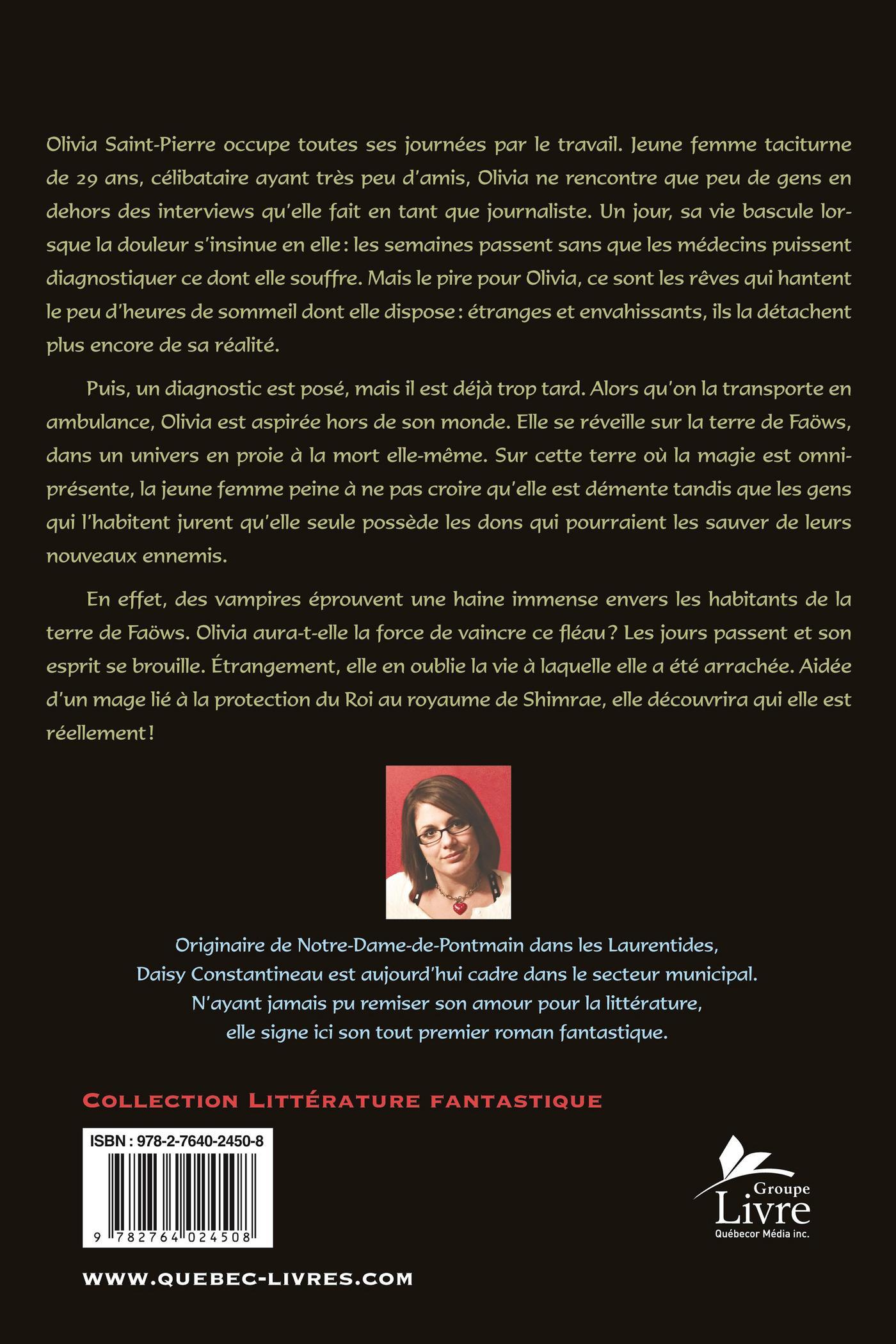 En effet, des vampires éprouvent une haine immense envers les habitants de la terre de Faöws. Olivia aura-t-elle la force de vaincre ce fléau ? Les jours passent et son esprit se brouille. Étrangement, elle en oublie la vie à laquelle elle a été arrachée. Aidée d'un mage lié à la protection du Roi au royaume de Shimrae, elle découvrira qui elle est réellement !