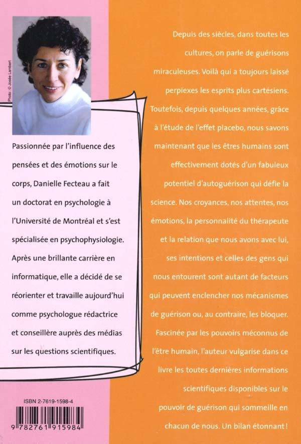 Depuis toujours, des guérisons soi-disant miraculeuses se produisent, laissant le raisonnement dit cartésien perplexe ou embarrassé. Toutefois, grâce à l’étude de l’effet placebo, nous savons maintenant que les êtres humains sont effectivement dotés d’un fabuleux potentiel d’autoguérison, potentiel qui défie la science. Nos croyances, nos attentes, nos émotions, le thérapeute, notre relation avec celui-ci et avec les gens qui nous entourent sont autant de facteurs qui peuvent enclencher nos mécanismes de guérison ou, au contraire, les bloquer. Fascinée par les pouvoirs méconnus des êtres humains, Danielle Fecteau vulgarise dans ce livre les toutes dernières informations scientifiques disponibles sur la question du pouvoir de guérison qui sommeille en chacun de nous.