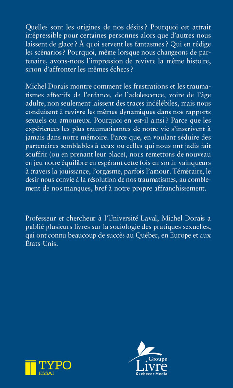 .Michel Dorais montre comment les frustrations et les traumatismes affectifs de l'enfance, de l'adolescence, voire de l'âge adulte, non seulement laissent des traces indélébiles, mais nous conduisent à revivre les mêmes dynamiques dans nos rapports sexuels ou amoureux. Pourquoi en est-il ainsi ? Parce que les expériences les plus traumatisantes de notre vie s'inscrivent à jamais dans notre mémoire. Parce que, en voulant séduire des partenaires semblables à ceux ou celles qui nous ont jadis fait souffrir (ou en prenant leur place), nous remettons de nouveau en jeu notre équilibre en espérant cette fois en sortir vainqueurs à travers la jouissance, l'orgasme, parfois l'amour. Téméraire, le désir nous convie à la résolution de nos traumatismes, au comblement de nos manques, bref à notre propre affranchissement.