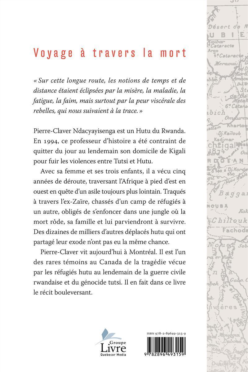 Avec sa femme et ses trois enfants, il a vécu cinq années de déroute, traversant l'Afrique à pied d'est en ouest en quête d'un asile toujours plus lointain. Traqués à travers l'ex-Zaïre, chassés d'un camp de réfugiés à un autre, obligés de s'enfoncer dans une jungle où la mort rôde, sa famille et lui parviendront à survivre. Des dizaines de milliers d'autres déplacés hutu qui ont partagé leur exode n'ont pas eu la même chance. Pierre-Claver vit aujourd'hui à Montréal. Il est l'un des rares témoins au Canada de la tragédie vécue par les réfugiés hutu au lendemain de la guerre civile rwandaise et du génocide tutsi. Il en fait dans ce livre le récit bouleversant.