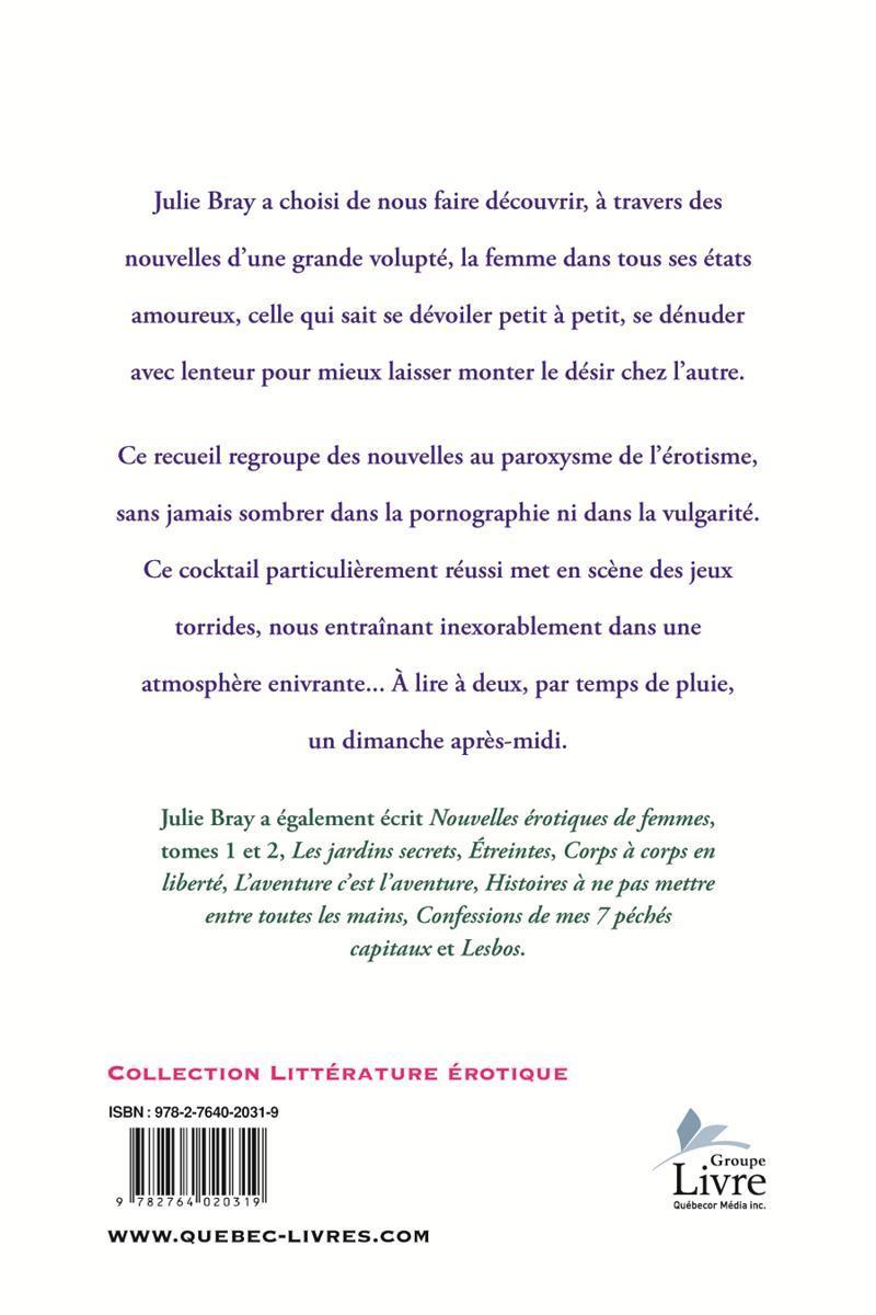 Julie Bray a choisi de nous faire découvrir, à travers des nouvelles d'une grande volupté, la femme dans tous ses états amoureux, celle qui sait se dévoiler petit à petit, se dénuder avec lenteur pour mieux laisser monter le désir chez l'autre. Ce recueil regroupe des nouvelles au paroxysme de l'érotisme, sans jamais sombrer dans la pornographie ni dans la vulgarité. Ce cocktail particulièrement réussi met en scène des jeux torrides, nous entraînant inexorablement dans une atmosphère enivrante... À lire à deux, par temps de pluie, un dimanche après-midi. Julie Bray a également écrit Nouvelles érotiques de femmes , tomes 1 et 2, Les jardins secrets , Étreintes , Corps à corps en liberté , L'aventure c'est l'aventure , Histoires à ne pas mettre entre toutes les mains , Confessions de mes 7 péchés capitaux et Lesbos .