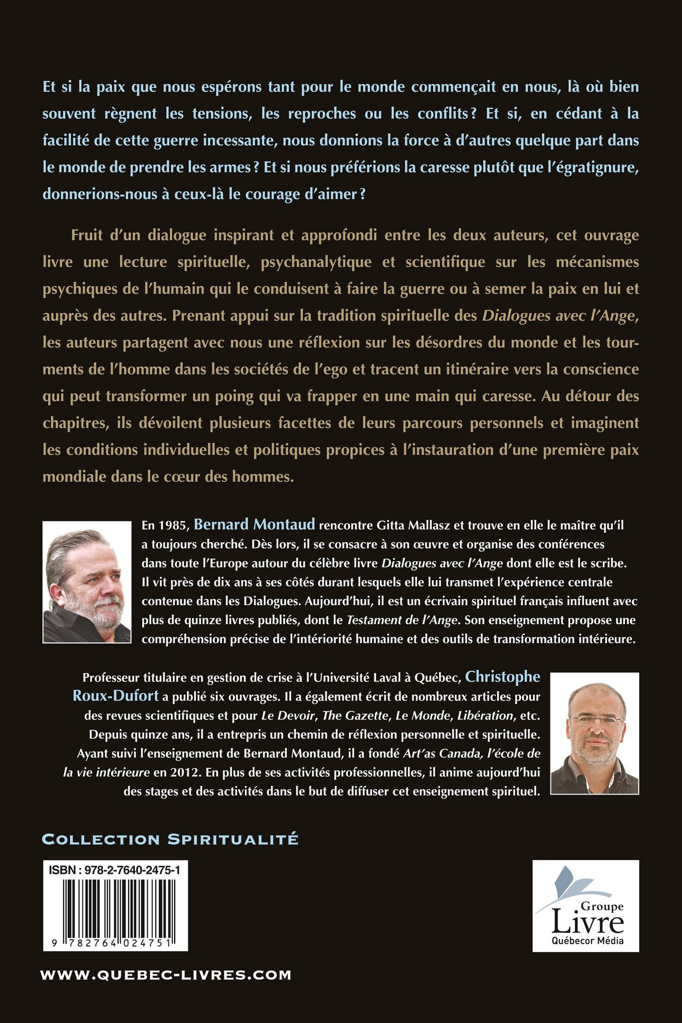 .Fruit d'un dialogue inspirant et approfondi entre les deux auteurs, cet ouvrage livre une lecture spirituelle, psychanalytique et scientifique sur les mécanismes psychiques de l'humain qui le conduisent à faire la guerre ou à semer la paix en lui et auprès des autres. Prenant appui sur la tradition spirituelle des Dialogues avec l'Ange, les auteurs partagent avec nous une réflexion sur les désordres du monde et les tourments de l'homme dans les sociétés de l'ego et tracent un itinéraire vers la conscience qui peut transformer un poing qui va frapper en une main qui caresse. Au détour des chapitres, ils dévoilent plusieurs facettes de leurs parcours personnels et imaginent les conditions individuelles et politiques propices à l'instauration d'une première paix mondiale dans le cœur des hommes.