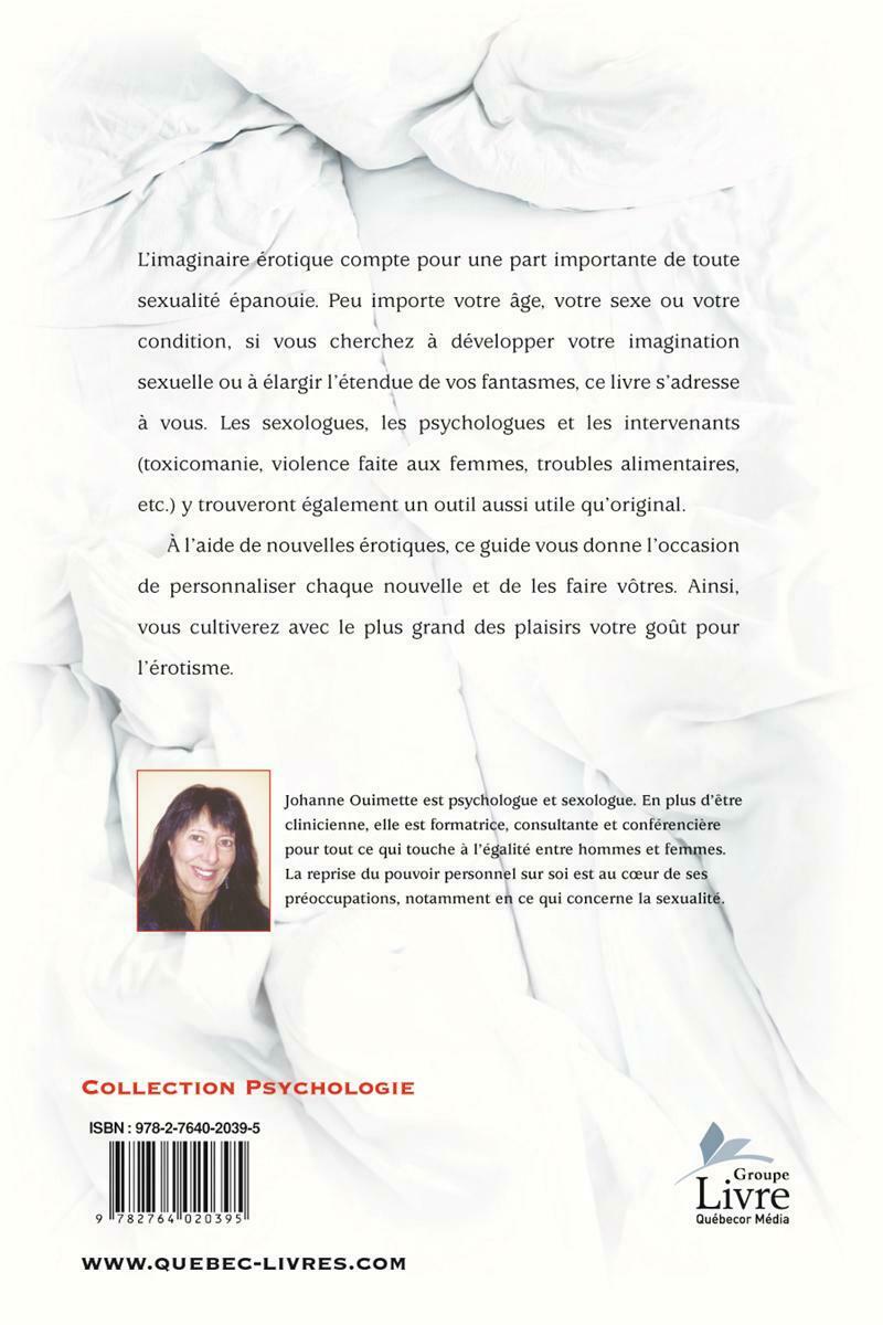 L'imaginaire érotique compte pour une part importante de toute sexualité épanouie. Peu importe votre âge, votre sexe ou votre condition, si vous cherchez à développer votre imagination sexuelle ou à élargir l'étendue de vos fantasmes, ce livre s'adresse à vous. Les sexologues, les psychologues et les intervenants (toxicomanie, violence faite aux femmes, troubles alimentaires, etc.) y trouveront également un outil aussi utile qu'original. À l'aide de nouvelles érotiques, ce guide vous donne l'occasion de personnaliser chaque nouvelle et de les faire vôtres. Ainsi, vous cultiverez avec le plus grand des plaisirs votre go ût pour l'érotisme. Johanne Ouimette est psychologue et sexologue. En plus d'être clinicienne, elle est formatrice, consultante et conférencière pour tout ce qui touche à l'égalité entre hommes et femmes. La reprise du pouvoir personnel sur soi est au cœur de ses préoccupations, notamment en ce qui concerne la sexualité.