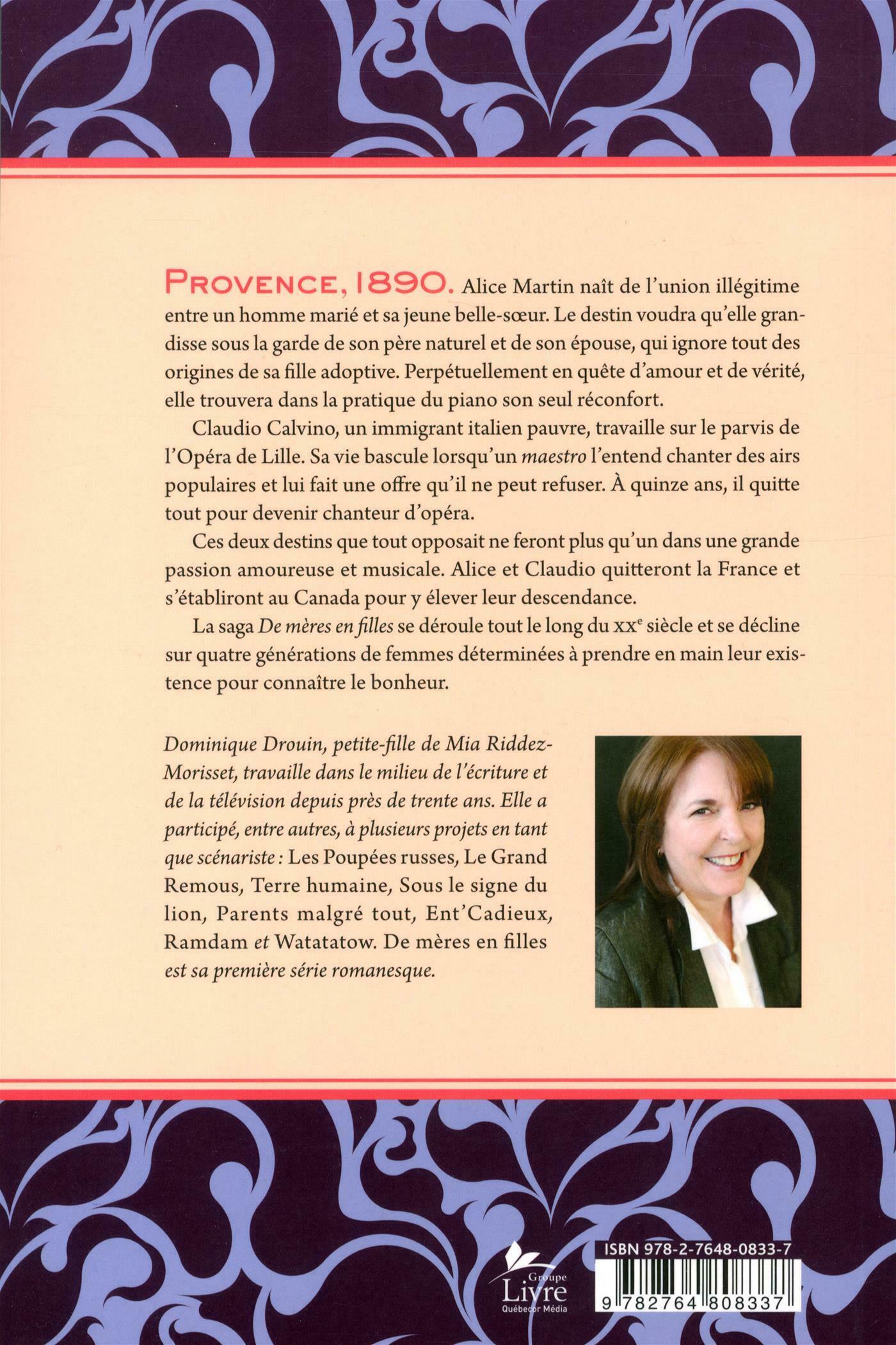 Provence, 1890. Alice Martin naît de l'union illégitime entre un homme marié et sa jeune belle-sœur. Le destin voudra qu'elle grandisse sous la garde de son père naturel et de son épouse, qui ignore tout des origines de sa fille adoptive. Perpétuellement en quête d'amour et de vérité, elle trouvera dans la pratique du piano son seul réconfort. . .Claudio Calvino, un immigrant italien pauvre, travaille sur le parvis de l'Opéra de Lille. Sa vie bascule lorsqu'un maestro l'entend chanter des airs populaires et lui fait une offre qu'il ne peut refuser. À quinze ans, il quitte tout pour devenir chanteur d'opéra. . .Ces deux destins que tout opposait ne feront plus qu'un dans une grande passion amoureuse et musicale. Alice et Claudio quitteront la France et s'établiront au Canada pour y élever leur descendance. . .Alice, premier tome de la saga De mères en filles, se déroule tout le long du XXe siècle et se décline sur quatre générations de femmes déterminées à prendre en main leur existence pour connaître le bonheur. . .Dominique Drouin travaille dans le milieu de l'écriture et de la télévision depuis près de trente ans. Elle vient elle-même d'une famille d'artistes : son arrière-grand-père était un baryton fort connu et sa grand-mère a longtemps écrit pour la radio et la télévision. Diplômée en sociologie et en communications, elle a un parcours professionnel impressionnant : auteure, conseillère, script-éditrice, chargée de cours et directrice de maisons d'édition. Elle a participé à plusieurs projets en tant que scénariste : Les Poupées russes, Le Grand Remous, Terre humaine, Sous le signe du lion, Parents malgré tout, Ent'Cadieux, Ramdam et Watatatow. .De mères en filles est sa première série romanesque.
