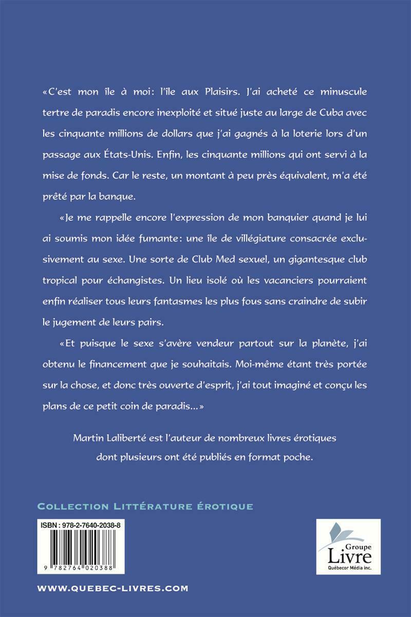 «C'est mon île à moi: l'île aux Plaisirs. J'ai acheté ce minuscule tertre de paradis encore inexploité et situé juste au large de Cuba avec les cinquante millions de dollars que j'ai gagnés à la loterie lors d'un passage aux États-Unis. Enfin, les cinquante millions qui ont servi à la mise de fonds. Car le reste, un montant à peu près équivalent, m'a été prêté par la banque. «Je me rappelle encore l'expression de mon banquier quand je lui ai soumis mon idée fumante: une île de villégiature consacrée exclusivement au sexe. Une sorte de Club Med sexuel, un gigantesque club tropical pour échangistes. Un lieu isolé où les vacanciers pourraient enfin réaliser tous leurs fantasmes les plus fous sans craindre de subir le jugement de leurs pairs. «Et puisque le sexe s'avère vendeur partout sur la planète, j'ai obtenu le financement que je souhaitais. Moi-même étant très portée sur la chose, et donc très ouverte d'esprit, j'ai tout imaginé et conçu les plans de ce petit coin de paradis...» Martin Laliberté est l'auteur de nombreux livres érotiques dont plusieurs ont été publiés en format poche.
