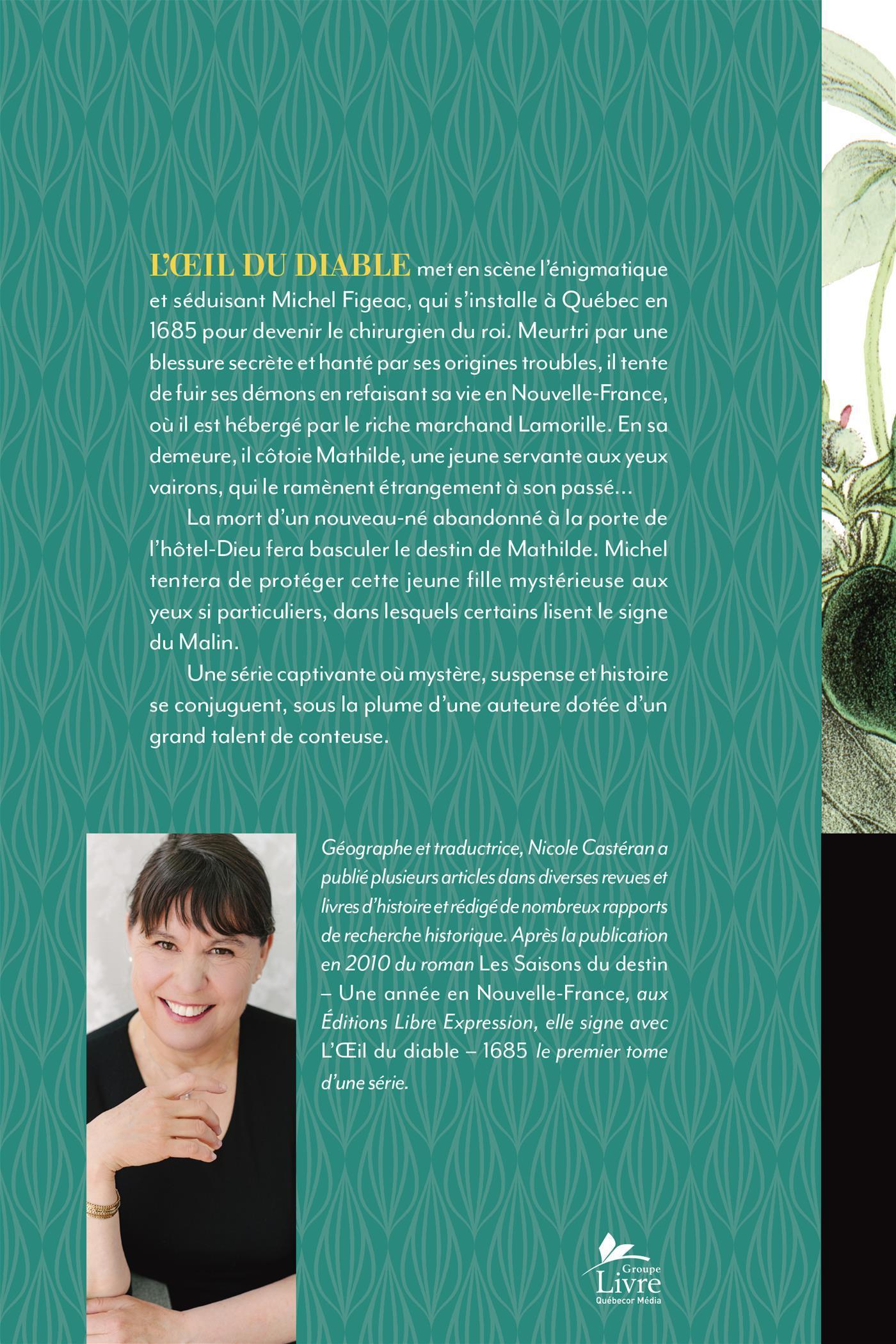 L'Œil du diable met en scène l'énigmatique et séduisant Michel Figeac, qui s'installe à Québec en 1685 pour devenir le chirurgien du roi. Meurtri par une blessure secrète et hanté par ses origines troubles, il tente de fuir ses démons en refaisant sa vie en Nouvelle-France, où il est hébergé par le riche marchand Lamorille. En sa demeure, il côtoie Mathilde, une jeune servante aux yeux vairons, qui le ramènent étrangement à son passé…