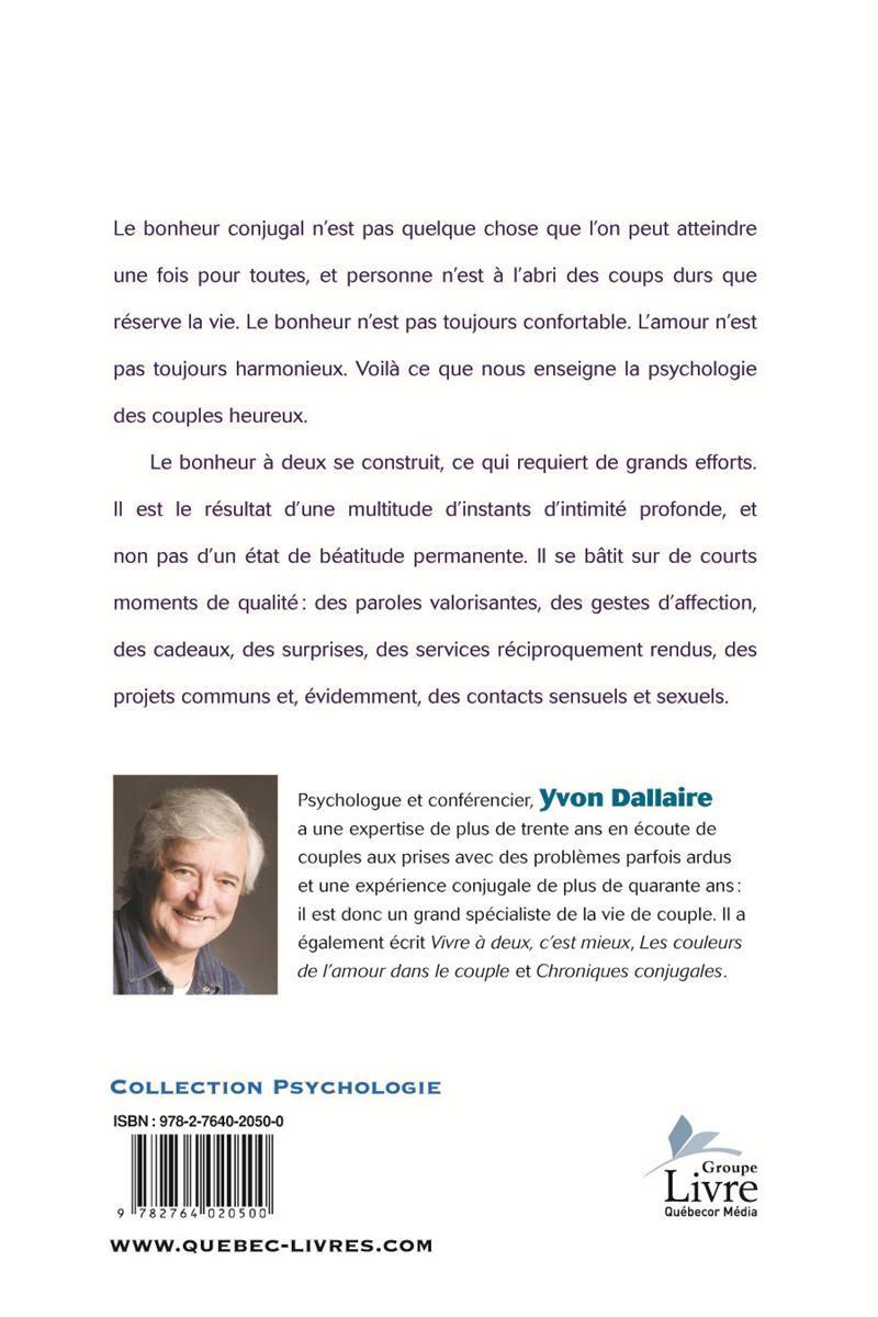 Le bonheur conjugal n'est pas quelque chose que l'on peut atteindre une fois pour toutes, et personne n'est à l'abri des coups durs que réserve la vie. Le bonheur n'est pas toujours confortable. L'amour n'est pas toujours harmonieux. Voilà ce que nous enseigne la psychologie des couples heureux. Le bonheur à deux se construit, ce qui requiert de grands efforts. Il est le résultat d'une multitude d'instants d'intimité profonde, et non pas d'un état de béatitude permanente. Il se bâtit sur de courts moments de qualité?: des paroles valorisantes, des gestes d'affection, des cadeaux, des surprises, des services réciproquement rendus, des projets communs et, évidemment, des contacts sensuels et sexuels. Psychologue et conférencier, Yvon Dallaire a une expertise de plus de trente ans en écoute de couples aux prises avec des problèmes parfois ardus et une expérience conjugale de plus de quarante ans?: il est donc un grand spécialiste de la vie de couple. Il a également écrit Vivre à deux, c'est mieux , Les couleurs de l'amour dans le couple et Chroniques conjugales .