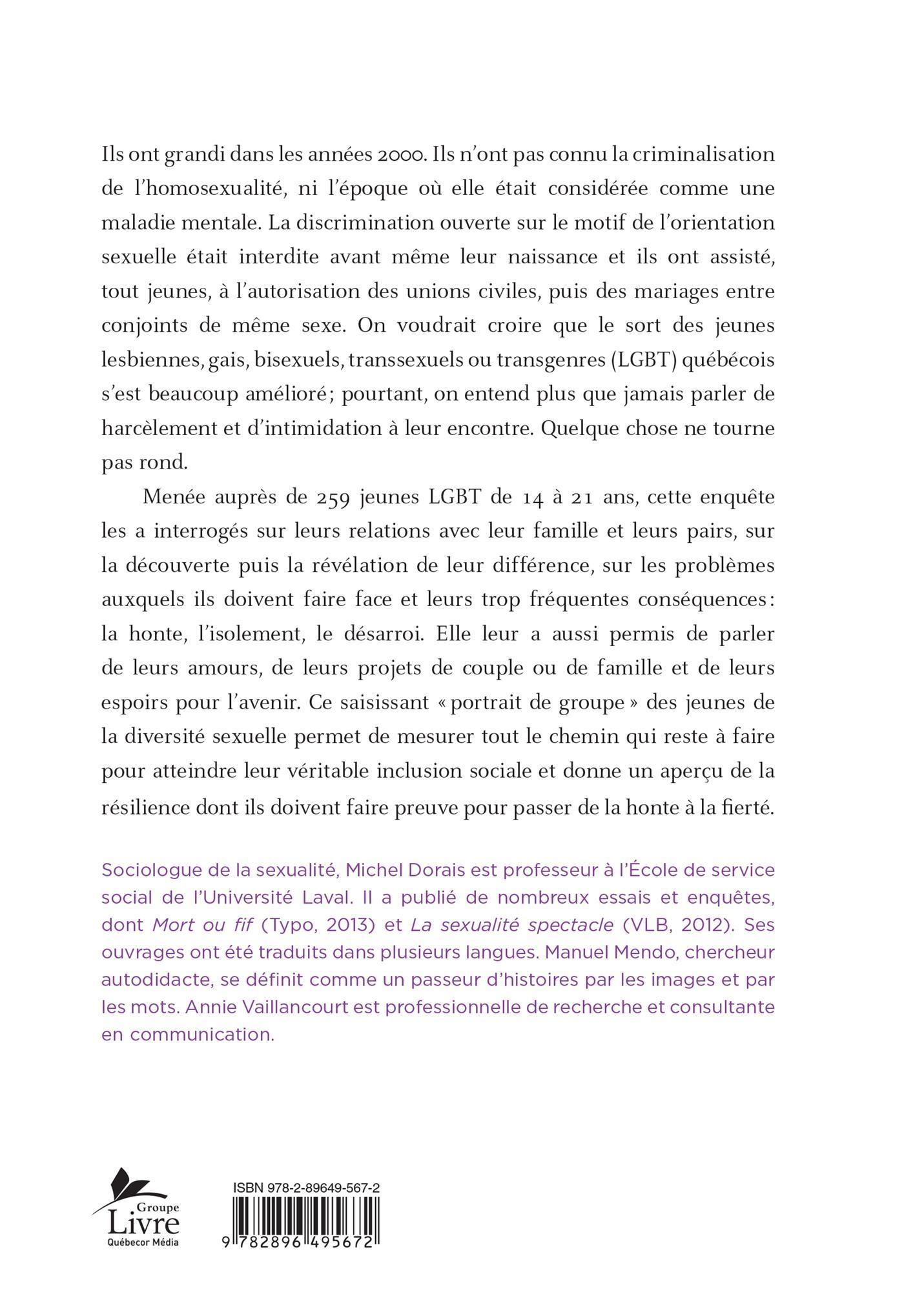 Menée auprès de 259 jeunes LGBT de 14 à 21 ans, cette enquête les a interrogés sur leurs relations avec leur famille et leurs pairs, sur la découverte puis la révélation de leur différence, sur les problèmes auxquels ils doivent faire face et leurs trop fréquentes conséquences : la honte, l'isolement, le désarroi. Elle leur a aussi permis de parler de leurs amours, de leurs projets de couple ou de famille et de leurs espoirs pour l'avenir. Ce saisissant « portrait de groupe » des jeunes de la diversité sexuelle permet de mesurer tout le chemin qui reste à faire pour atteindre leur véritable inclusion sociale et donne un aperçu de la résilience dont ils doivent faire preuve pour passer de la honte à la fierté.