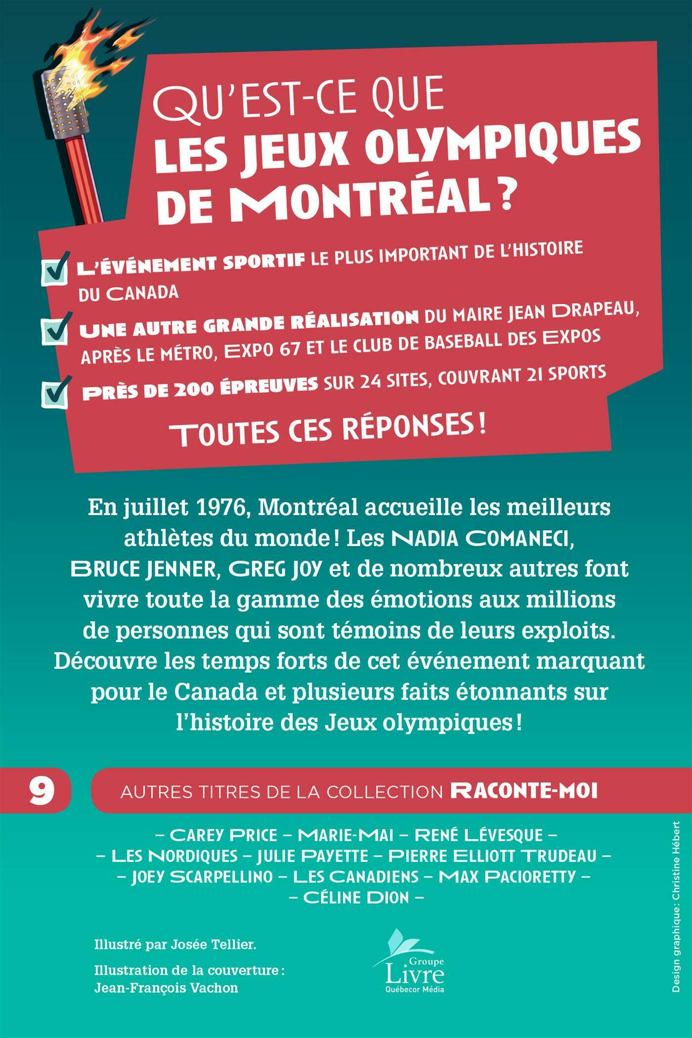 Qu'est-ce que les Jeux olympiques de Montréal? . .- L'événement sportif le plus important de l'histoire du Canada .- Une autre grande réalisation du maire Jean Drapeau, après le métro, Expo 67 et le club de baseball des Expos .- Près de 200 épreuves sur 24 sites, couvrant 21 sports . .En juillet 1976, Montréal accueille les meilleurs athlètes du monde! Les Nadia Comaneci, Bruce Jenner, Greg Joy et de nombreux autres font vivre toute la gamme des émotions aux millions de personnes qui sont témoins de leurs exploits. Découvre les temps forts de cet événement marquant pour le Canada et plusieurs faits étonnants sur l'histoire des Jeux olympiques!