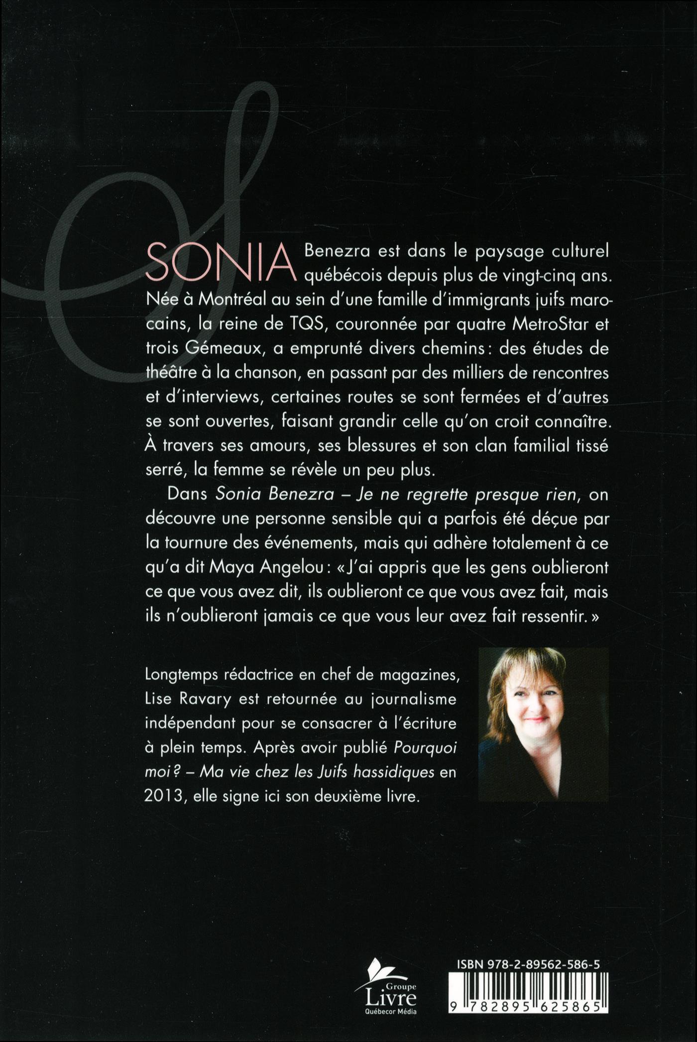.Dans Sonia Benezra – Je ne regrette presque rien, on découvre une personne sensible qui a parfois été déçue par la tournure des événements, mais qui adhère totalement à ce qu'a dit Maya Angelou : « J'ai appris que les gens oublieront ce que vous avez dit, ils oublieront ce que vous avez fait, mais ils n'oublieront jamais ce que vous leur avez fait ressentir. »