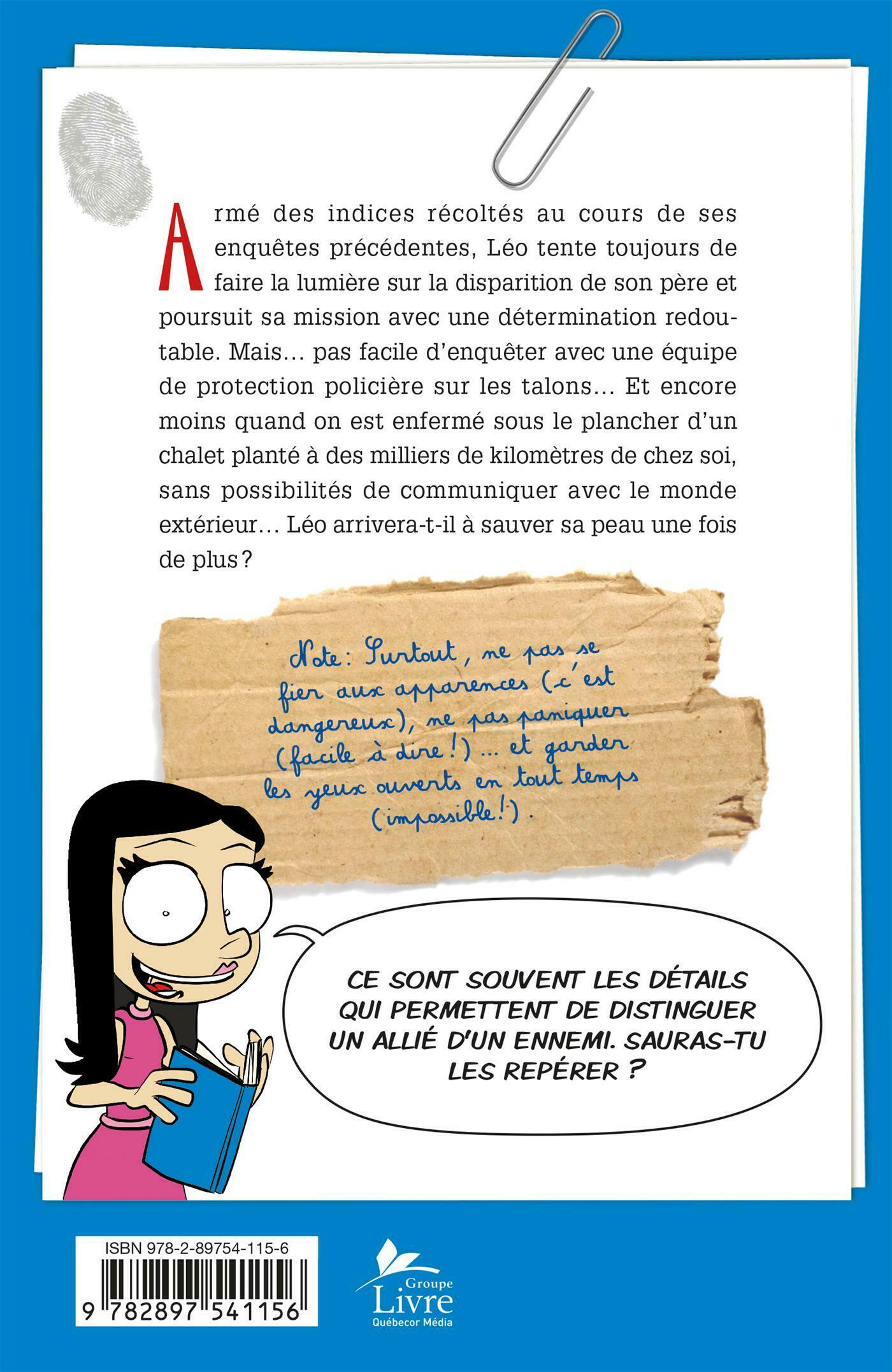 Armé des indices récoltés au cours de ses enquêtes précédentes, Léo tente toujours de faire la lumière sur la disparition de son père et poursuit sa mission avec une détermination redoutable. Mais… pas facile d'enquêter avec une équipe de protection policière sur les talons… . .Et encore moins quand on est enfermé sous le plancher d'un chalet planté à des milliers de kilomètres de chez soi, sans possibilité de communiquer avec le monde extérieur… . .Léo arrivera-t-il à sauver sa peau une fois de plus?