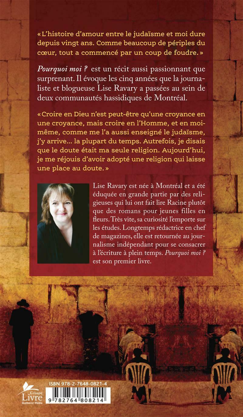 La journaliste et blogueuse Lise Ravary est tombée amoureuse du judaïsme au point de vouloir se convertir. Élevée dans la religion catholique, éduquée en grande partie par les religieuses, elle a cessé de croire à l'adolescence. Comment était-il alors possible qu'elle ressente l'appel de cette foi millénaire et étrangère ? Cette foi qui refuse plus de candidats à la conversion qu'elle n'en accepte. Comment se faisait-il qu'elle se sente chez elle au pied du mur des Lamentations, à Jérusalem ? Et surtout, pourquoi ça, pourquoi elle et pourquoi à ce moment-là ? Ce récit raconte les cinq années que Lise Ravary a passées au sein de deux communautés hassidiques de Montréal, dans les années 1990. Ce sont des Juifs ultra-orthodoxes de Montréal qui l'ont éduquée. Elle a été reçue, bichonnée, nourrie, admirée par des hommes et des femmes hassidiques, principalement de la communauté Loubavitch. Ses deux filles, qui n'avaient nullement l'intention de se convertir, ont elles aussi été accueillies à bras ouverts dans ces maisons aux portes closes. L'auteure déborde inévitablement sur sa vie mouvementée précédant cette période afin de donner un sens à cette rencontre déterminante et aux années pendant lesquelles elle a été pratiquante. Les hassidim connaissent beaucoup plus de choses sur notre monde que nous sur le leur. Truffé d'anecdotes et dans un style propre à l'auteure, ce livre tente de rétablir l'équilibre.