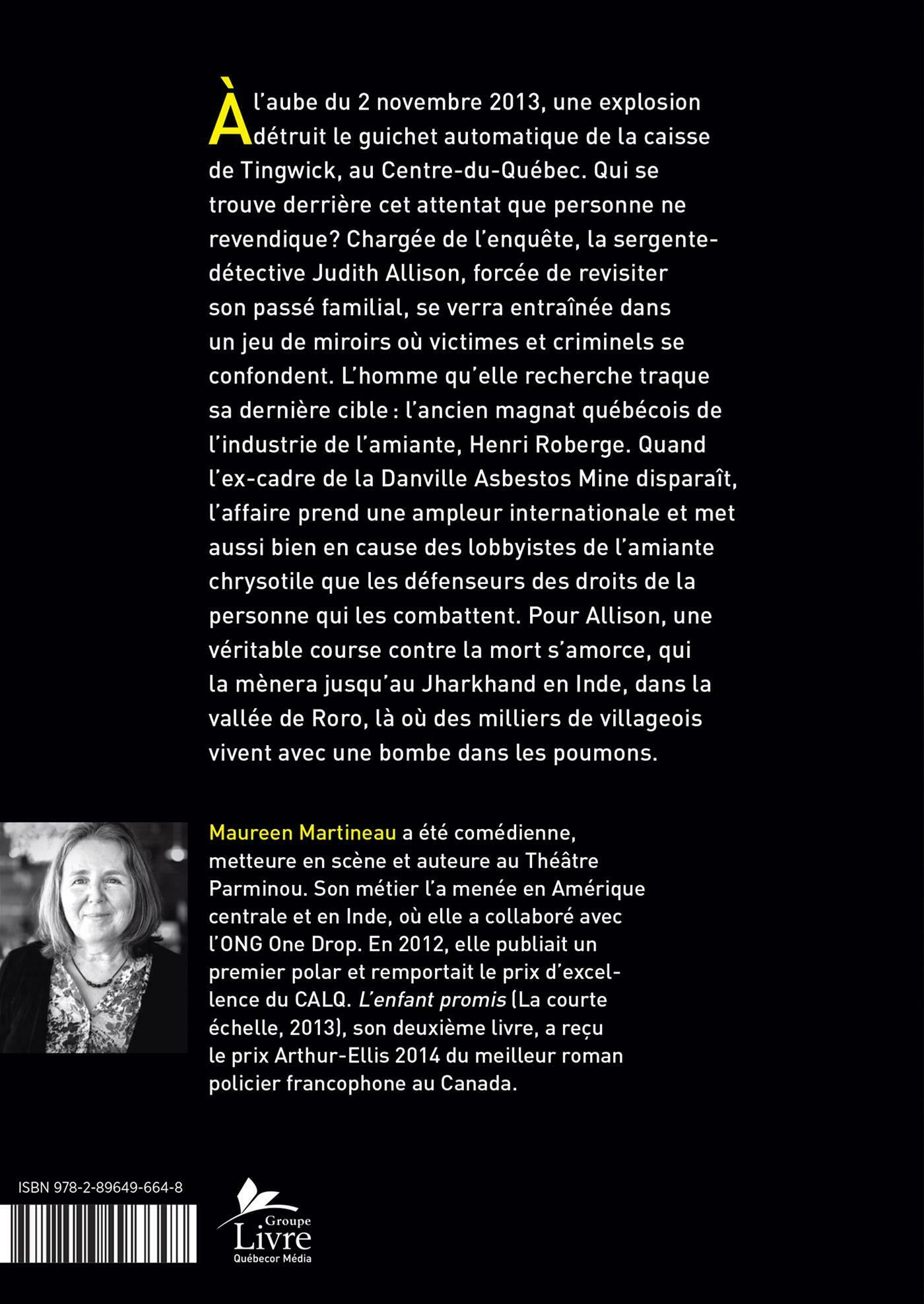 À l'aube du 2 novembre 2013, une explosion détruit le guichet automatique de la caisse de Tingwick, au Centre-du-Québec. Qui se trouve derrière cet attentat que personne ne revendique? Chargée de l'enquête, la sergente-détective Judith Allison, forcée de revisiter son passé familial, se verra entraînée dans un jeu de miroirs où victimes et criminels se confondent. L'homme qu'elle recherche traque sa dernière cible : l'ancien magnat québécois de l'industrie de l'amiante, Henri Roberge. Quand l'ex-cadre de la Danville Asbestos Mine disparaît, l'affaire prend une ampleur internationale et met aussi bien en cause des lobbyistes de l'amiante chrysotile que les défenseurs des droits de la personne qui les combattent. Pour Allison, une véritable course contre la mort s'amorce, qui la mènera jusqu'au Jharkhand en Inde, dans la vallée de Roro, là où des milliers de villageois vivent avec une bombe dans les poumons.