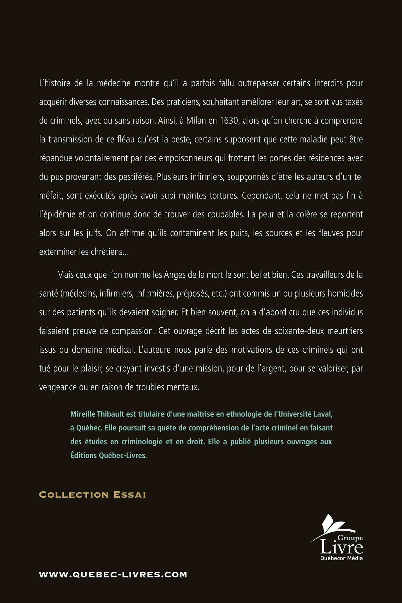 . Mais ceux que l'on nomme les Anges de la mort le sont bel et bien. Ces travailleurs de la santé (médecins, infirmiers, infirmières, préposés, etc.) ont commis un ou plusieurs homicides sur des patients qu'ils devaient soigner. Et bien souvent, on a d'abord cru que ces individus faisaient preuve de compassion. Cet ouvrage décrit les actes de soixante-deux meurtriers issus du domaine médical. L'auteure nous parle des motivations de ces criminels qui ont tué pour le plaisir, se croyant investis d'une mission, pour de l'argent, pour se valoriser, par vengeance ou en raison de troubles mentaux.