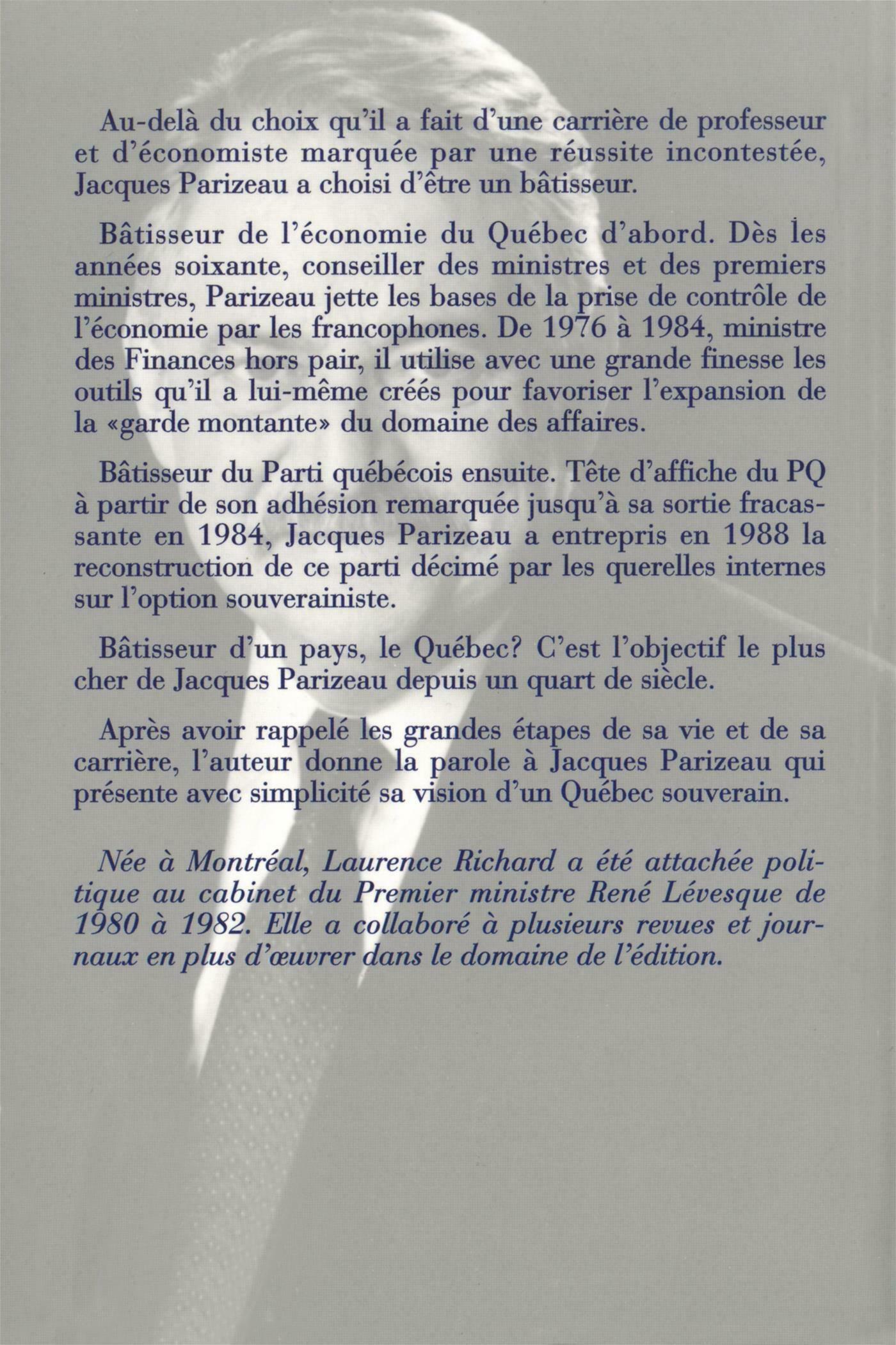 .Après avoir rappelé les grandes étapes de sa vie et de sa carrière, l'auteur donne la parole à Jacques Parizeau qui présente avec simplicité sa vision d'un Québec souverain.
