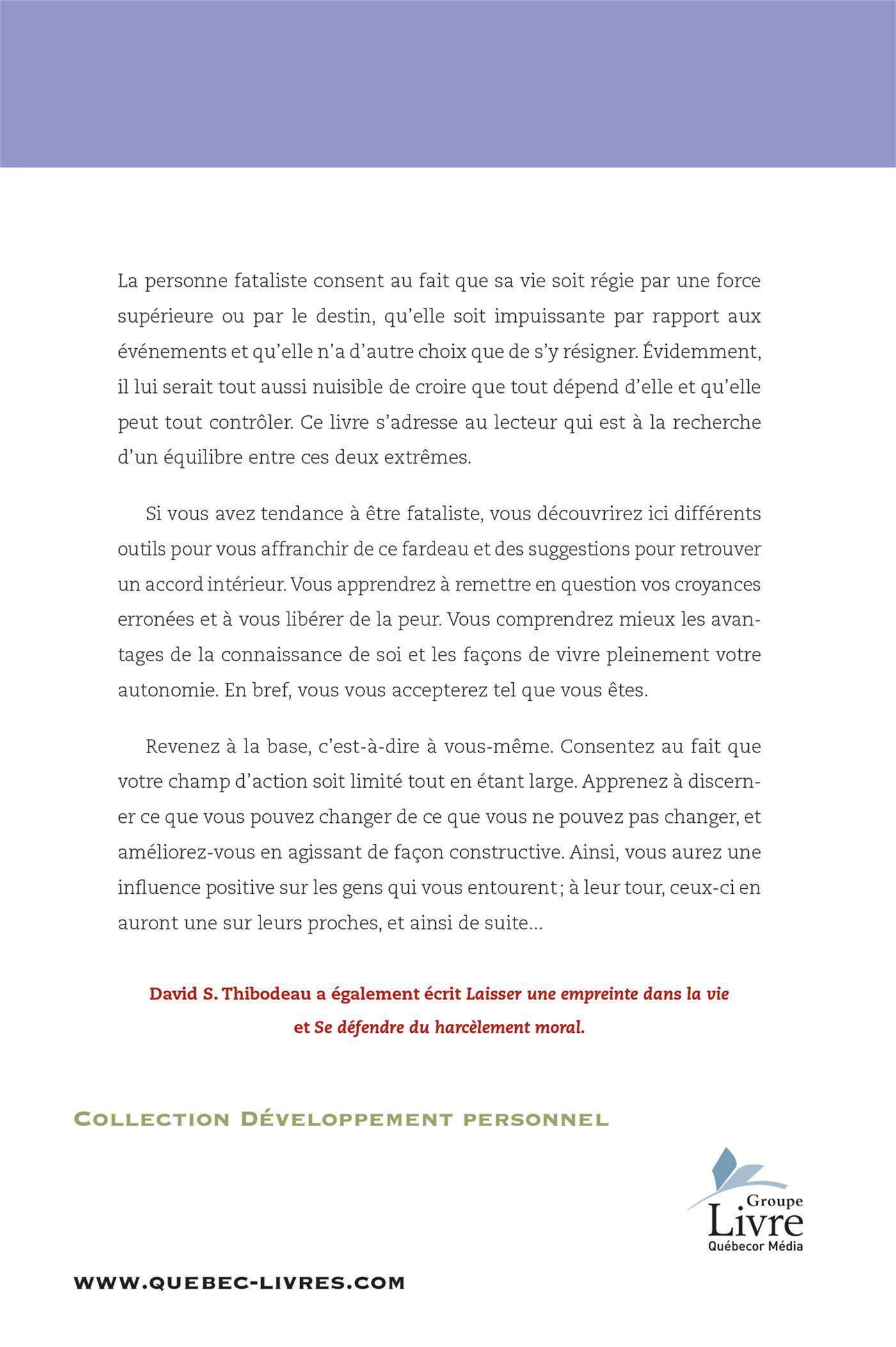 La personne fataliste consent au fait que sa vie soit régie par une force supérieure ou par le destin, qu'elle soit impuissante par rapport aux événements et qu'elle n'a d'autre choix que de s'y résigner. Évidemment, il lui serait tout aussi nuisible de croire que tout dépend d'elle et qu'elle peut tout contrôler. Ce livre s'adresse au lecteur qui est à la recherche d'un équilibre entre ces deux extrêmes.