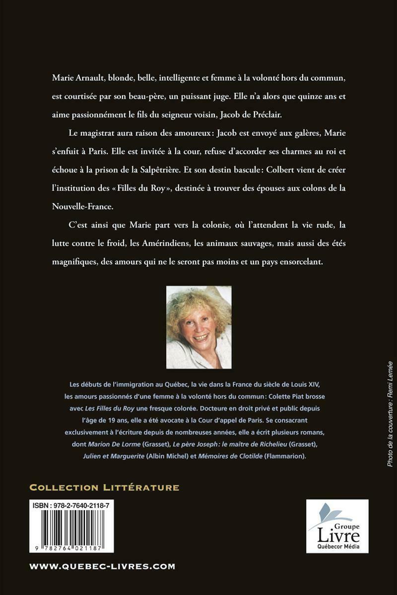..Les débuts de l'immigration au Québec, la vie dans la France du siècle de Louis XIV, les amours passionnés d'une femme à la volonté hors du commun: Colette Piat brosse avec Les Filles du Roy une fresque colorée. Docteure en droit privé et public depuis l'âge de 19 ans, elle a été avocate à la Cour d'appel de Paris. Se consacrant exclusivement à l'écriture depuis de nombreuses années, elle a écrit plusieurs romans, dont Marion De Lorme (Grasset), Le père Joseph: le maître de Richelieu (Grasset), Julien et Marguerite (Albin Michel) et Mémoires de Clotilde (Flammarion).