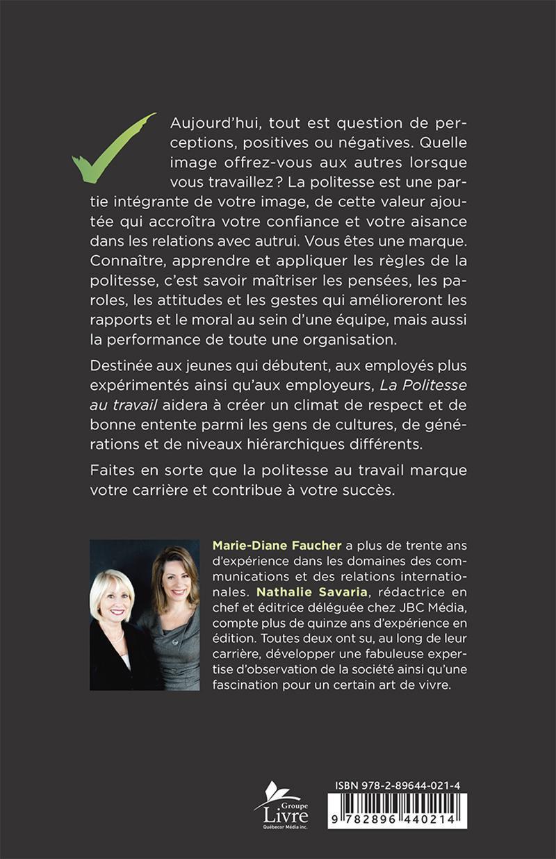 Est-ce que, en réunion, quelqu'un reçoit toujours des appels « des plus urgents » ? Le jeune et nouvel employé a ses écouteurs sur les oreilles alors que son patron lui parle ? La secrétaire du bureau vous fait suivre des chaînes de lettres ou, mieux encore, elle tente de vous vendre des chocolats pour le financement du spectacle de sa plus jeune ? Votre employé, qui par ailleurs travaille très bien, s'habille comme s'il allait à un show de rock alors que votre entreprise reçoit du public ? Avez-vous déjà vu le string de votre collègue de travail ou plongez-vous régulièrement les yeux dans son décolleté vertigineux ? Les auteures Marie-Diane Faucher et Nathalie Savaria répondront aux mille et une questions qui mettent souvent en péril la paix en milieu professionnel. La Politesse au travail fera de vous un expert du savoir-vivre au bureau et aura pour effet de faire de vous la meilleure recrue, le meilleur employé ou encore le meilleur président pour votre entreprise. Cet ouvrage s'adresse aux employés et gestionnaires de tous les milieux, sans oublier ceux qui débutent sur le marché du travail.
