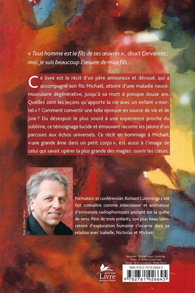 Ce livre est le récit d’un père amoureux et dévoué, qui a accompagné son fils Michaël, atteint d’une maladie neuromusculaire dégénérative, jusqu’à sa mort à presque douze ans. Quelles sont les leçons qu’apporte la vie avec un enfant « mortel » ? Comment convertir une telle épreuve en source de vie et de joie ? Du désespoir le plus sourd à une expérience proche du sublime, ce témoignage lucide et émouvant raconte les jalons d’un parcours aux échos universels. Ce récit en hommage à Michaël, « une grande âme dans un petit corps », est aussi à l’image de celui qui savait opérer la plus grande des magies : ouvrir les cœurs.