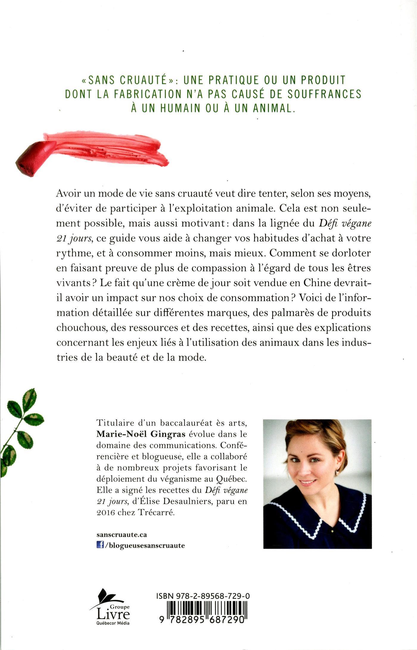 Avoir un mode de vie sans cruauté veut dire tenter, selon ses moyens, d'éviter de participer à l'exploitation animale. Cela est non seulement possible, mais aussi motivant : dans la lignée du Défi végane 21 jours, ce guide vous aide à changer vos habitudes d'achat à votre rythme, et à consommer moins, mais mieux. Comment se dorloter en faisant preuve de plus de compassion à l'égard de tous les êtres vivants ? Le fait qu'une crème de jour soit vendue en Chine devrait-il avoir un impact sur nos choix de consommation ? Voici de l'information détaillée sur différentes marques, des palmarès de produits chouchous, des ressources et des recettes, ainsi que des explications concernant les enjeux liés à l'utilisation des animaux dans les industries de la beauté et de la mode.